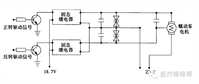 故障排除:蠕动泵电机根本不能转动。电机或电机电容器损坏,为了确保判断准确,将电机线断开,在仪器维护的蠕动泵的正、反转状态下测量电机端电压220V应正常,参考图2 蠕动泵电路。检查电容,电容损坏更换同型号电容,故障排除。