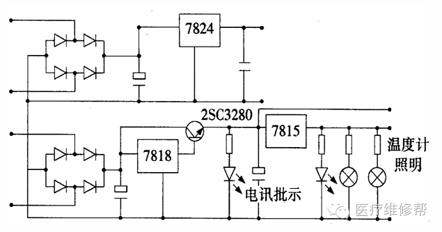故障排除:检查电磁阀全部都不工作,首先检查有无24 V直流供电,如无供电则测量稳压块7824或整流二极管是否损坏,参考图3 驱动板电源电路。