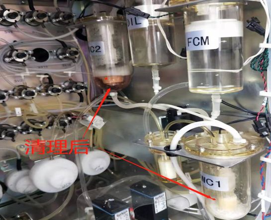 现场检查仪器报警信息后,拆开仪器右侧面板,检查各废液池/储液池;发现仪器WC2池内部特别脏,浮子传感器异物附着已经变色。