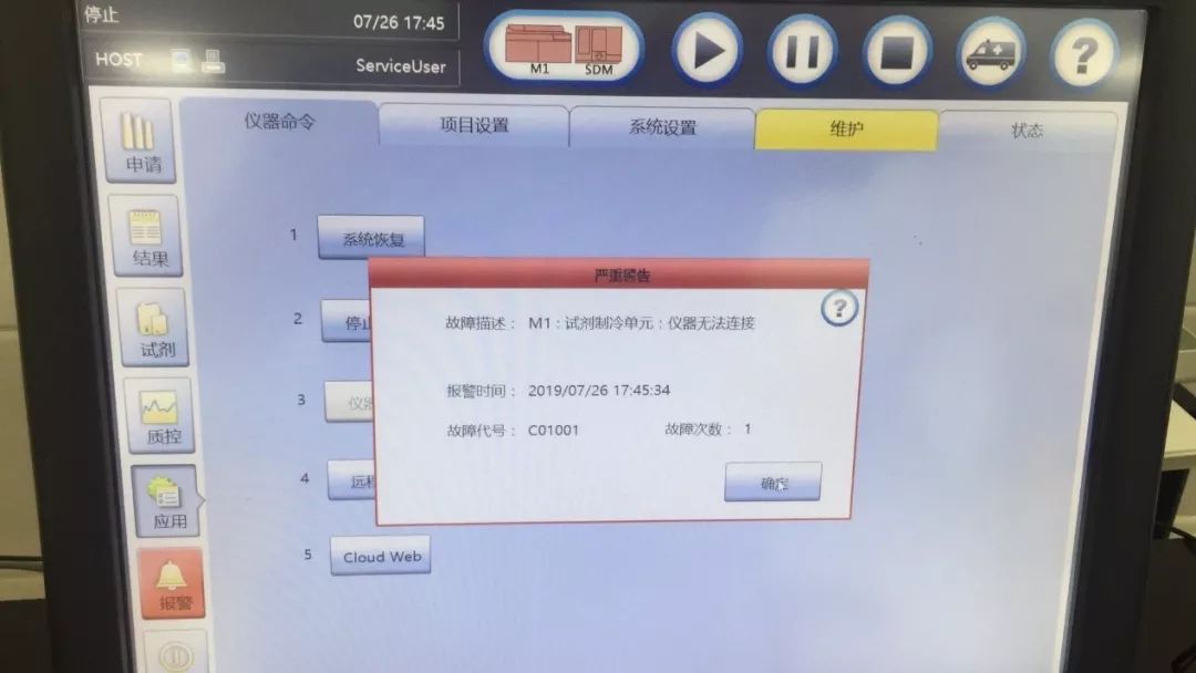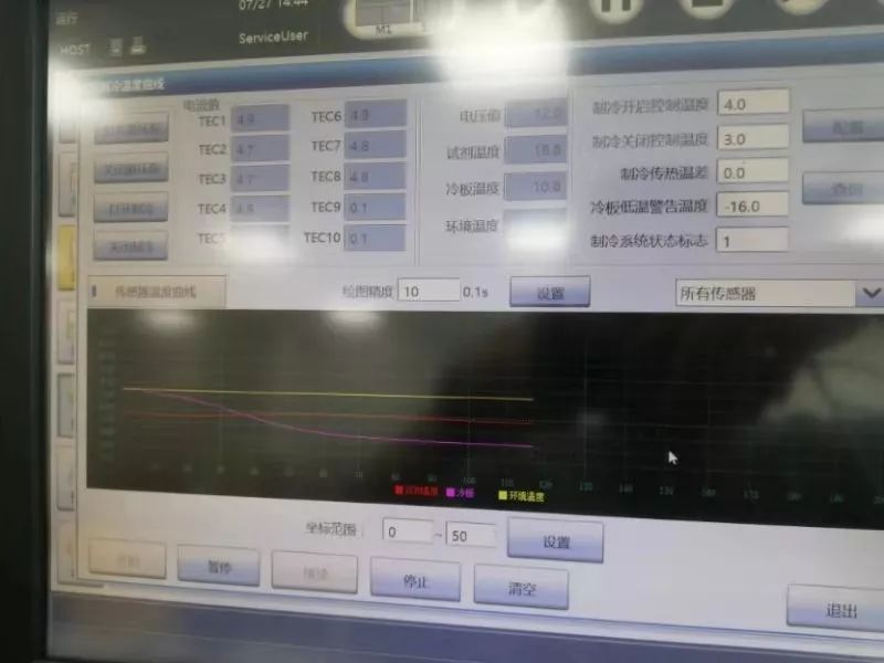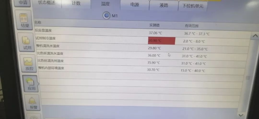 仪器开机初始化过程中一切正常,应用-状态中可以正常监测试剂制冷温度,但是仪器初始化结束,进入空闲状态时,应用-状态中的试剂制冷温度则不再出现任何变化,而且每当执行系统恢复时,仪器开始报警,然后停止运行。