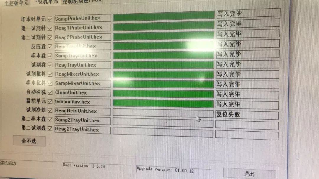 3、下位机程序在刷到试剂制冷时出现错误,程序写不进去,多次尝试都是一样,然后再次插拔试剂制冷板与主控板之间的信号线,以及仪器串口线,但是问题依旧。此时再次怀疑试剂制冷板故障,所以申请试剂制冷板。