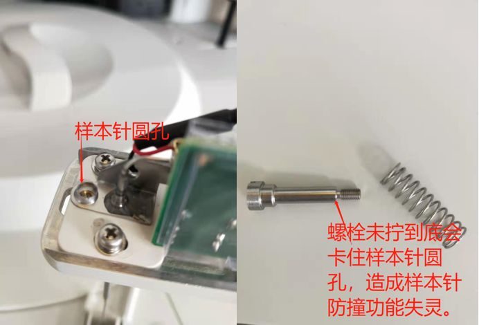 3、通过上述得知造成该故障的原因时样本针防撞光耦未触发。随即拆开加样针外壳,手动顶加样针发现根本顶不动,样本针无法触发防撞光耦。经检查发现固定样本针的螺栓未拧到底部,样本针的圆孔边缘正好卡在螺栓突出边缘。这样即使撞针也无法触发样本针防撞光耦,故障原因找到。