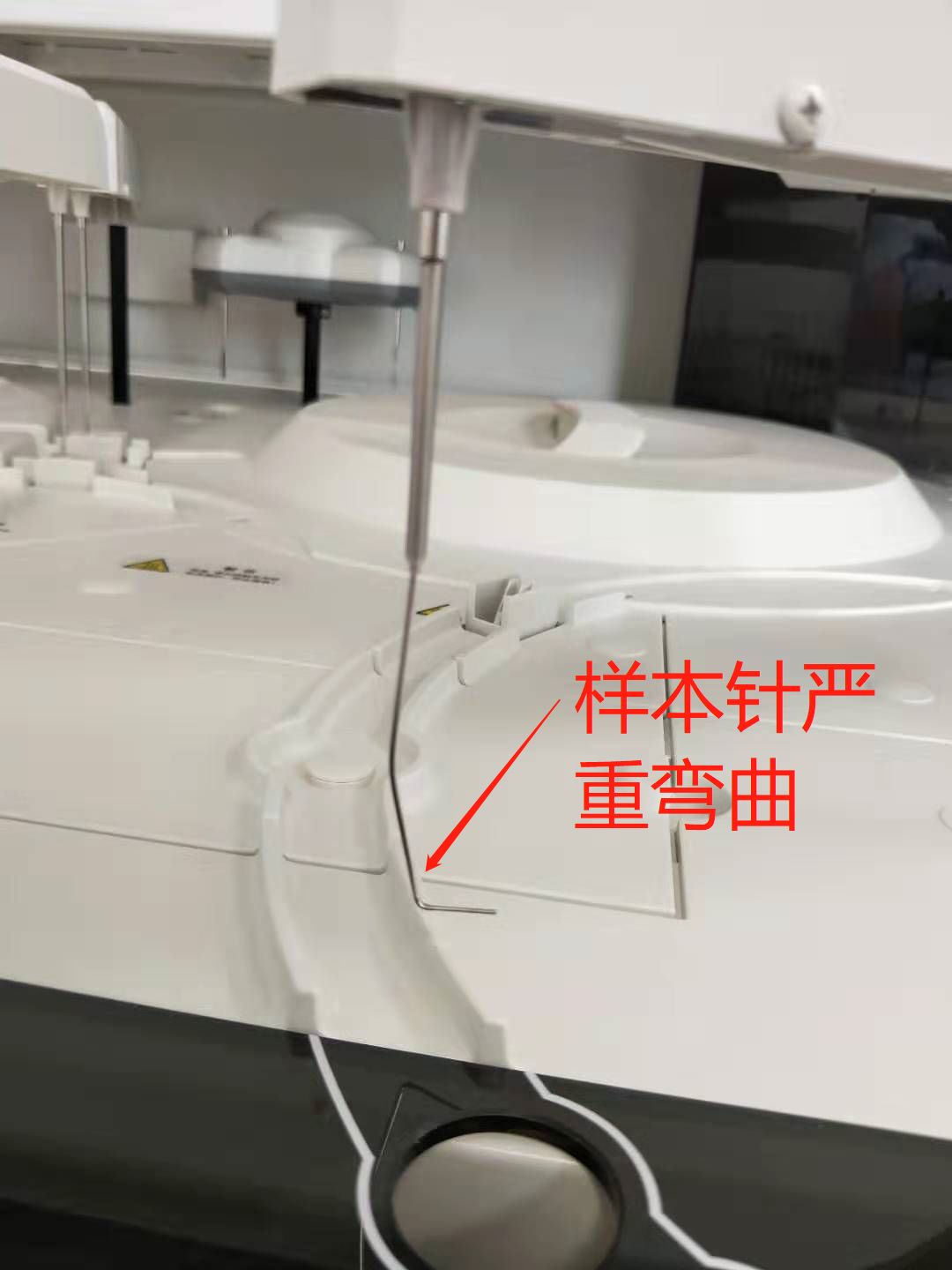 2、询问客户操作,及仪器出故障前现象。客户通过当时录的手机视频告知我当时仪器正在做定标。样本针首先在样本盘的内圈撞针,样本针下半部分略有弯曲,这时仪器并没有报警。随后加样针到达反应盘加样位置再次撞针,这时样本针被撞后已严重弯曲,仪器仍没有报警,客户紧急按下仪器开关。