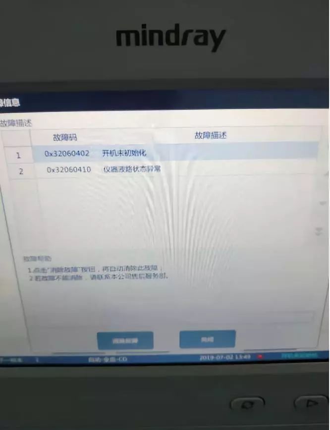仪器夜路状态异常,软件执行故障排除仪器仍报警;重启仪器,初始化过程中加样针下降到RBC池时报警,仪器初始化失败(如图)。