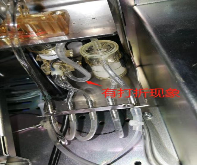 本次维修过程中还发现了另外一个潜在问题。RBC池与隔离室相连的管路有打折现象(如下图)。拆下管路修理后,两端对调,安装后没有打着现象。
