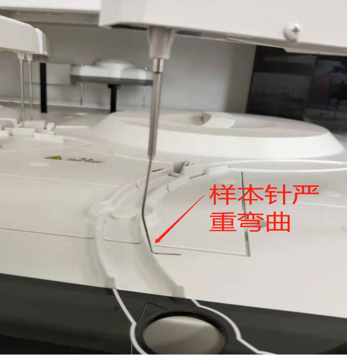 客户告知BS-800M样本针撞针,且样本针撞针后严重弯曲,仪器无报警。立刻申请BS-800M样本针组件配件,赶往现场。到达现场后检查仪器,发现样本针确实被严重撞弯。(如下图)