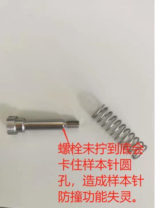 1.检查仪器报警信息,无样本针撞针的相关报警。 2.询问客户操作,及仪器出故障前现象。客户通过当时录的手机视频告知我当时仪器正在做定标。样本针首先在样本盘的内圈撞针,样本针下半部分略有弯曲,这时仪器并没有报警。随后加样针到达反应盘加样位置再次撞针,这时样本针被撞后已严重弯曲,仪器仍没有报警,客户紧急按下仪器开关。 3.通过上述得知造成该故障的原因时样本针防撞光耦未触发。随即拆开加样针外壳,手动顶加样针发现根本顶不动,样本针无法触发防撞光耦。经检查发现固定样本针的螺栓未拧到底部,样本针的圆孔边缘正好卡在螺栓突出边缘。这样即使撞针也无法触发样本针防撞光耦,故障原因找到。