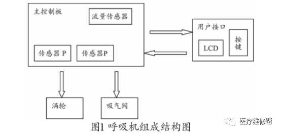 无创呼吸机的结构 该款呼吸机的主要组成部分有 :主控制板、用户接口、吸气阀和涡轮,呼吸机组成结构图,见图 1。