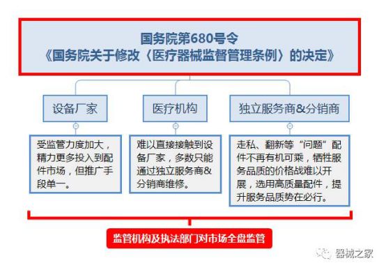 虽然我们还不清楚医疗器械设备厂家会否、会以什么形式来解决医疗机构与独立服务商&分销商获取原厂配件的渠道问题,但无论如何,《医疗器械监督管理条例》和新版《医疗器械分类目录》的推行,必然会对医疗器械维修服务市场现有格局带来改变。