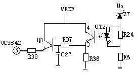 输出限压保护电路如下图,当输出电压升高,稳压管导通光耦导通,Q1基极有驱动电压而道通,UC3842③电压升高,输出降低,稳压管不导通,UC3842③电压降低,输出电压升高。周而复始,输出电压将稳定在一范围内(取决于稳压管的稳压值)。