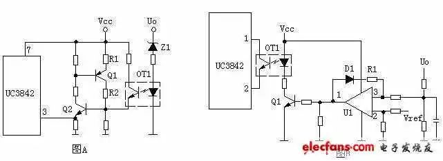 图A的工作原理是,当输出电压Uo升高,稳压管导通,光耦导通,Q2基极得电导通,由于Q2的导通Q1基极电压降低也导通,Vcc电压经R1、Q1、R2使Q2始终导通,UC3842③脚始终是高电平而停止工作。在图B中,UO升高U1③脚电压升高,①脚输出高电平,由于D1、R1的存在,U1①脚始终输出高电平Q1始终导通,UC3842①脚始终是低电平而停止工作。正反馈?