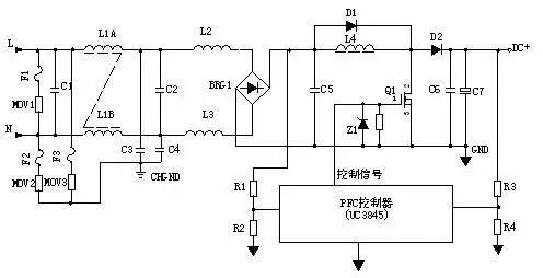2、工作原理: 输入电压经L1、L2、L3等组成的EMI滤波器,BRG1整流一路送PFC电感,另一路经R1、R2分压后送入PFC控制器作为输入电压的取样,用以调整控制信号的占空比,即改变Q1的导通和关断时间,稳定PFC输出电压。L4是PFC电感,它在Q1导通时储存能量,在Q1关断时施放能量。D1是启动二极管。D2是PFC整流二极管,C6、C7滤波。PFC电压一路送后级电路,另一路经R3、R4分压后送入PFC控制器作为PFC输出电压的取样,用以调整控制信号的占空比,稳定PFC输出电压。