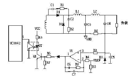 当输出 U0升高,经取样电阻R7、R8、R10、VR1分压后,U1③脚电压升高,当其超过U1②脚基准电压后 U1①脚输出高电平,使Q1导通,光耦OT1发光二极管发光,光电三极管导通,UC3842①脚电位相应变低,从而改变U1⑥脚输出占空比减小,U0降低。 当输出 U0降低时,U1③脚电压降低,当其低过U1②脚基准电压后U1①脚输出低电平,Q1不导通,光耦OT1发光二极管不发光,光电三极管不导通,UC3842①脚电位升高,从而改变U1⑥脚输出占空比增大,U0降低。周而复始,从而使输出电压保持稳定。调节VR1可改变输出电压值。
