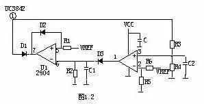 当输出短路,UC3842①脚电压上升,U1 ③脚 电位高于②脚时,比较器翻转①脚输出高电位,给 C1充电,当C1两端电压超过⑤脚基准电压时 U1⑦脚输出低电位,UC3842①脚低于1V,UCC3842 停止工作,输出电压为0V,周而复始,当短路 消失后电路正常工作。R2、C1是充放电时间常数, 阻值不对时短路保护不起作用。
