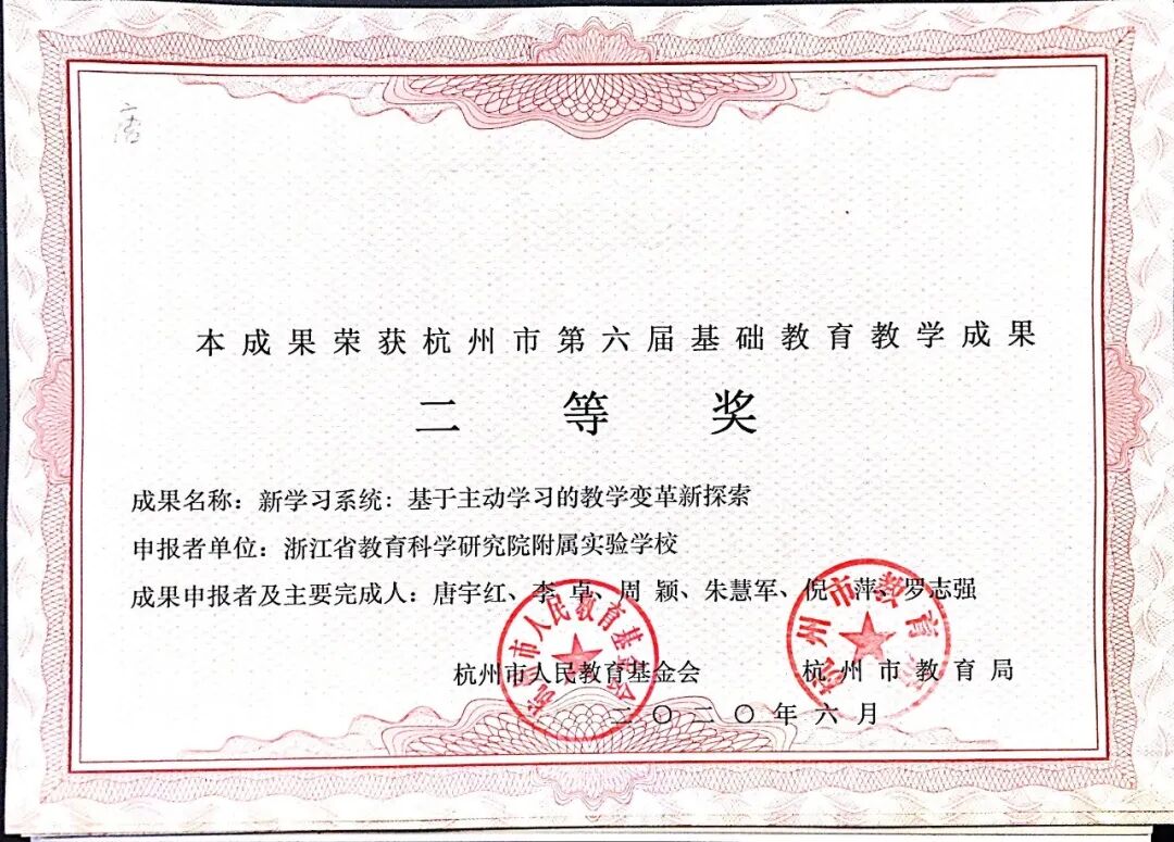 《新学习系统:生本理念下促进学生主动发展的研究与实践》获杭州市第六届基础教育教学成果二等奖(2020.6)