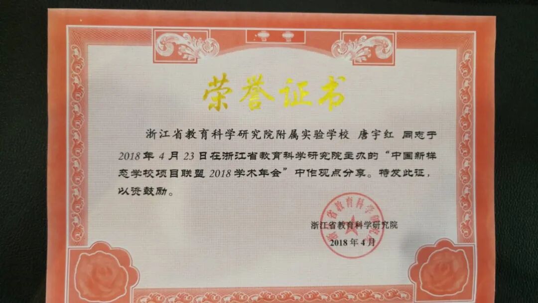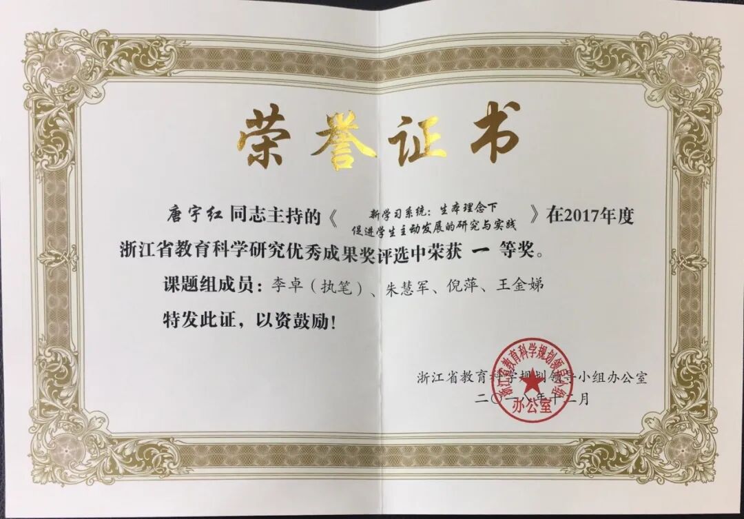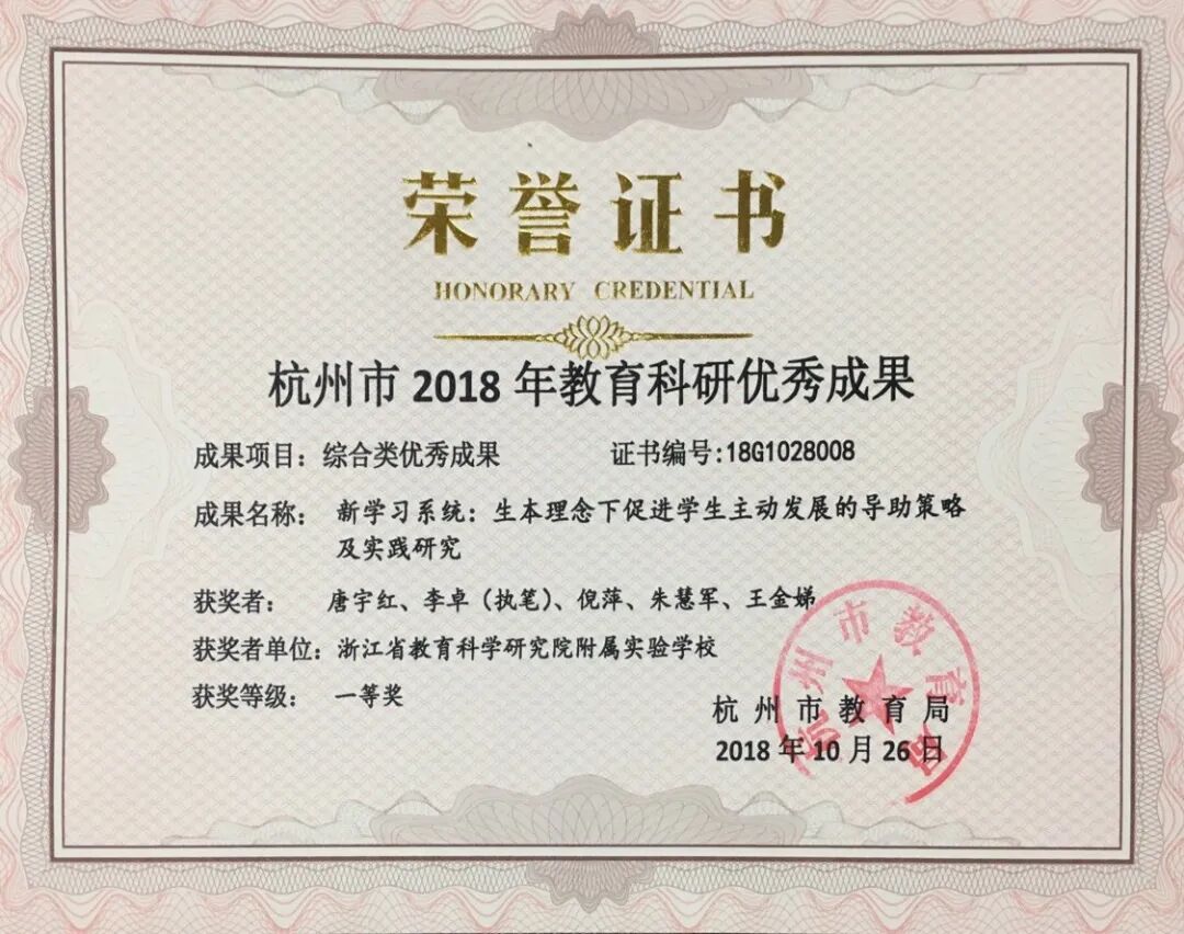 《新学习系统:生本理念下促进学生主动发展的导助策略及实践研究》获杭州市第 33 届教育科研优秀成果一等奖、浙江省教育科学研究优秀成果一等奖 (2018.12)