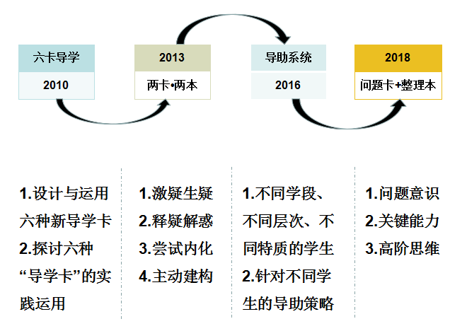 从利用“六卡导学”(2010)培养学生的学习习惯到“两卡·两本”(2013)激发学生学习的内驱力,到“导助结合”(2016)运用策略形成个性化学习助力,再到现阶段正在探索的“问题卡+整理本”(2018)促进学生高阶思维的发展。学校一直在进行“学教方式变革”的探索,学校致力于课堂、教学手段、导助系统、主动学习等有效提升教学质量的实践研究,也获得了丰富的成果。