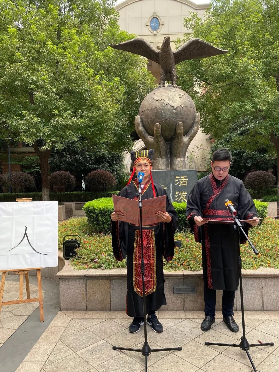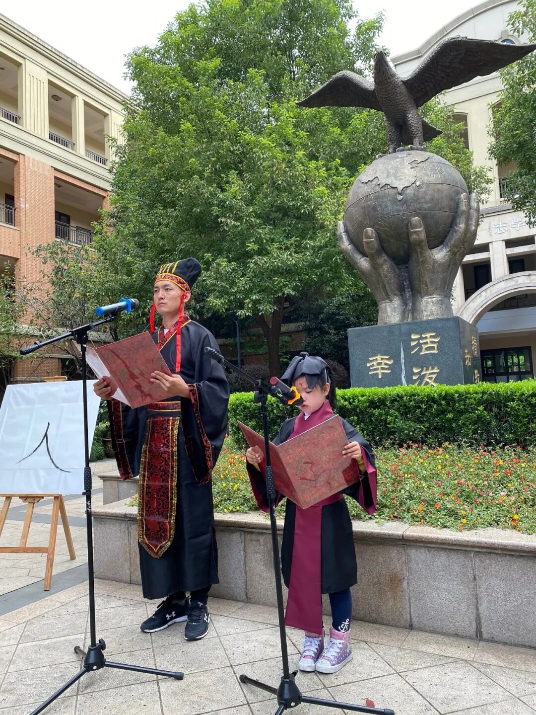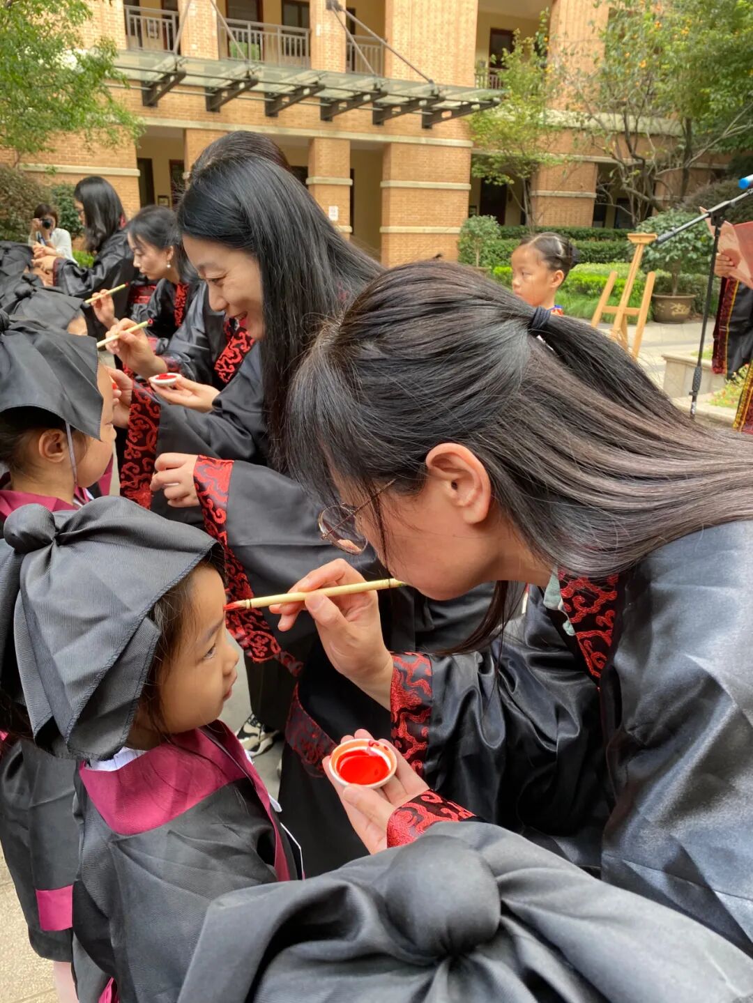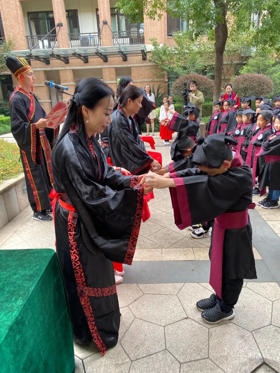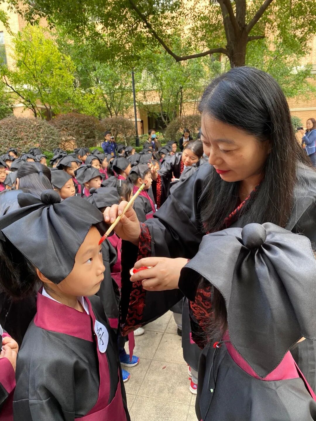 首先司仪潘老师带领同学们进行正衣冠环节:“童蒙之学,始于衣冠,先正衣冠,后明事理。”冠必正,纽必结,衣贵洁,不贵华。“端正衣冠”环节让孩子们懂得了正衣冠的含义。 “朱砂启智”是由师长用朱砂为刚入学的孩子在额头正中点上红痣,“痣”通“智”,意味开启智慧,这又称之为“开天眼”或“点聪明”寓意学子从此眼明心明,好读书。参加仪式的唐校长等学校领导和家长们一起为孩子们点朱砂,意为开启智慧,以此寄托美好的愿望,希望同学们通过阅读启迪智慧实现梦想。 “人字开笔”环节,学生代表(李润熙)上台书写“人”字,并进行展示。简单而意义深远的“人”字,寓意学子们在人生的启蒙阶段学会堂堂正正的做人,明道理。开笔礼上,学子要在师长的教导下学写第一个汉字“人”字。同学们专注地完成仪式每一个步骤,提笔,写字,落笔。孩子们对“上学写字”有了新的认识,感受到学习知识的重要。开笔礼仪式也在其心中印下“知礼懂礼”的烙印。 接下来是致辞环节,首先是师长代表陈洁老师致辞,然后是家长代表稽一灵爸爸致辞,最后是学生代表朱芷芸发言。 致辞结束后,就进入了拜谒师长环节。分别由三位学生代表上台(顾睿旻、任原铖、乐瀚韬)为三位教师老师代表敬茶(郭老师、许老师、韩老师),并向教师们行三鞠躬,表达了浓浓的尊师重教之情。 活动的最后,一年级全体学生一起恭诵三字经,为此次开笔礼活动画上了圆满的句号。  通过本次活动,孩子们在庄严的仪式中领略到了中华民族传统的勤学苦习、尊师孝亲、仁爱处世等文化精髓,把上学求知看成一个神圣的使命,增强了学习兴趣,进而从小树立正确的人生观、世界观和价值观。