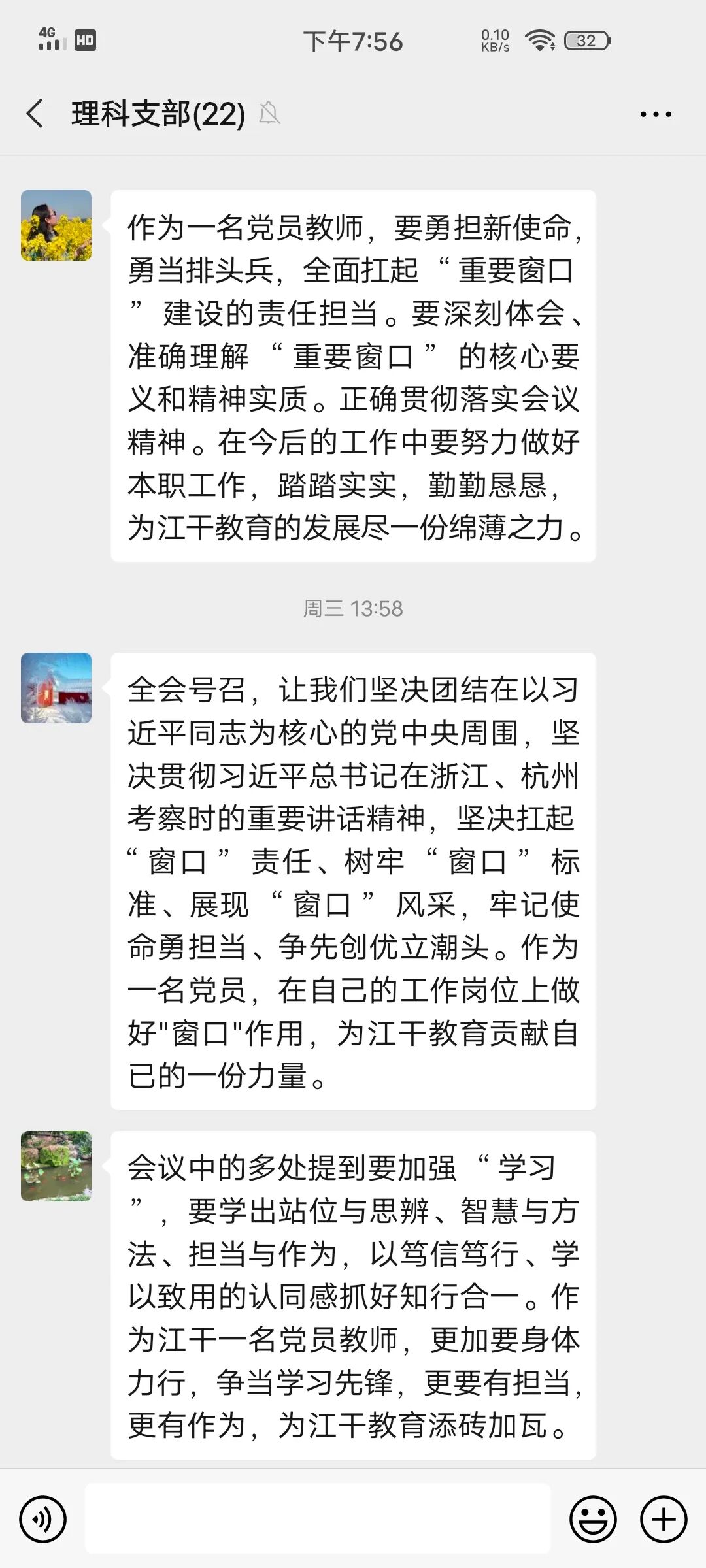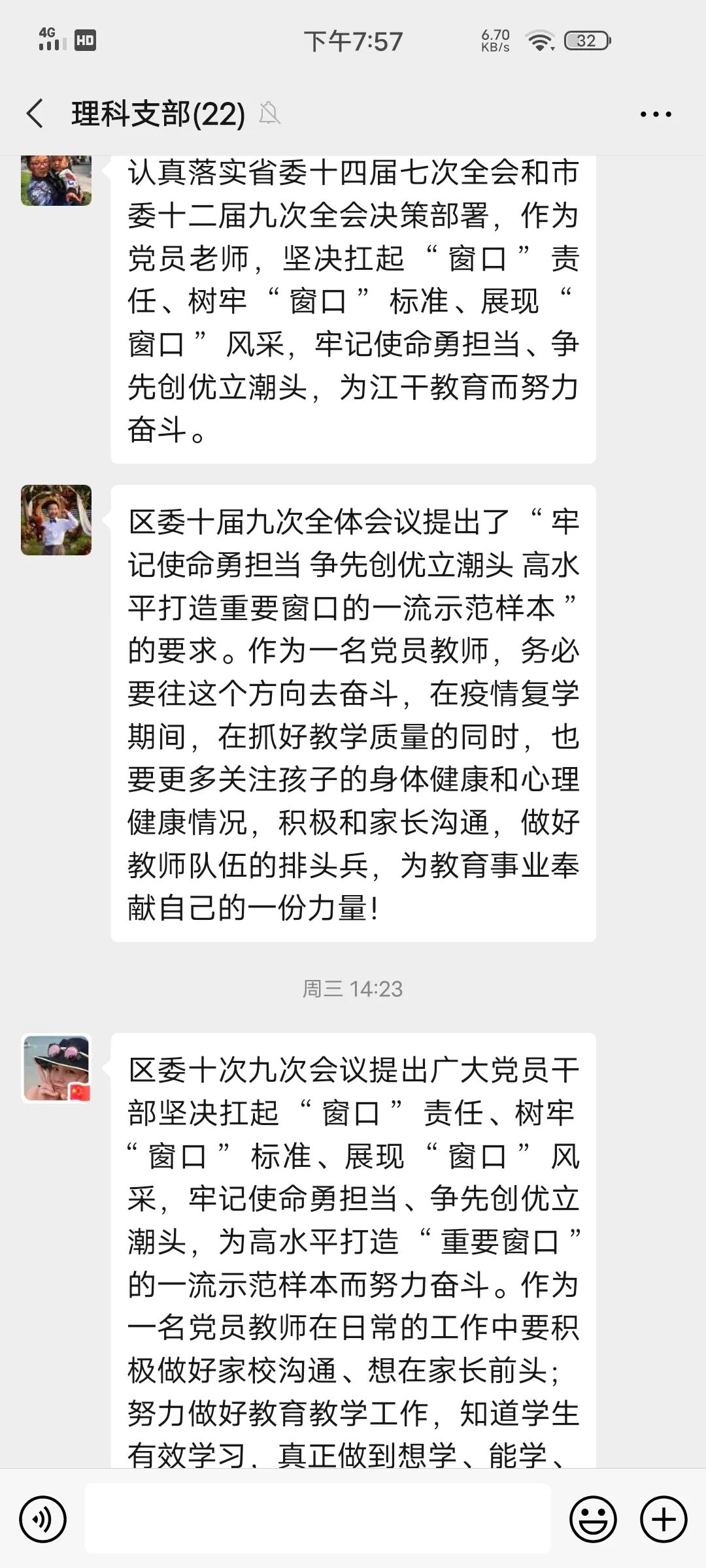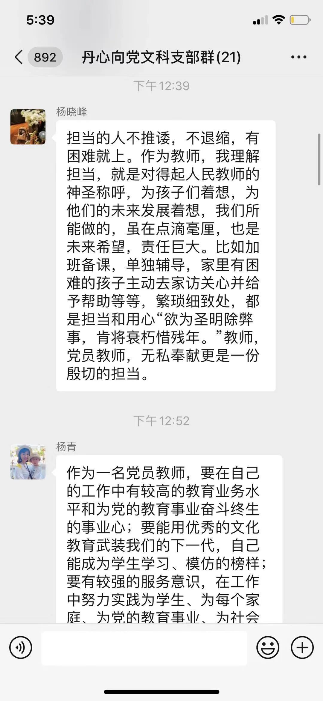 党课结束后,文科支部、理科支部分别进行线上交流学习体会,我校党员教师结合工作实际,纷纷发表学习感悟。