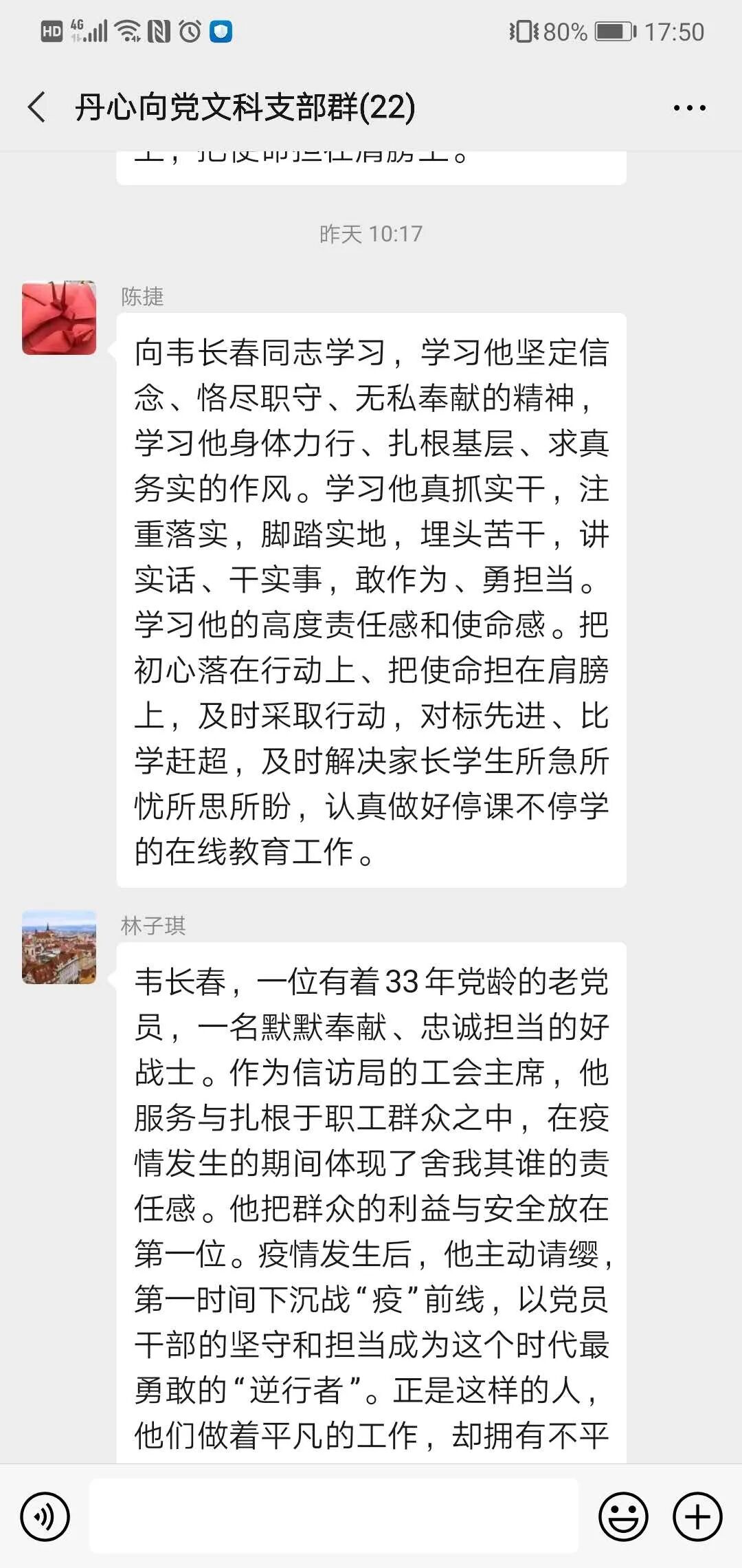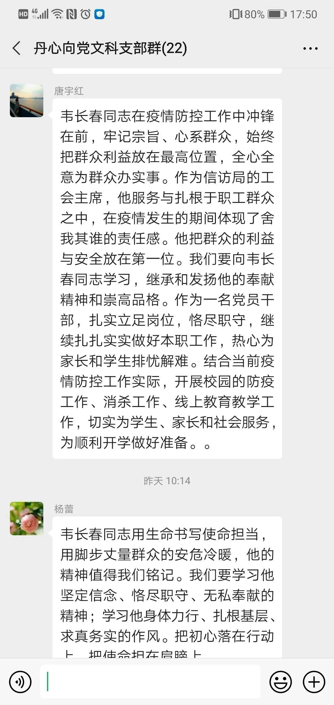 作为附校的党员教师,我们应像韦长春同志一样,在自己的岗位上默默耕耘,对学生负责,上好疫情期间的的每一堂网课,认真解决特殊时期的每一位学生的学习及心理困扰,做温暖的守护者。