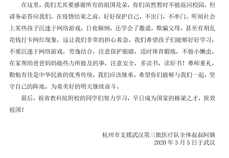 本来只是单纯地想以自己的方式表达对在武汉抗疫的医疗工作者们的感激之情,为武汉加油,为中国加油。没想到,3月5日,杭州市支援武汉第三批医疗队全体的叔叔阿姨们竟然就此视频,向我校三(1)中队共筑平安小队写了一封回信。