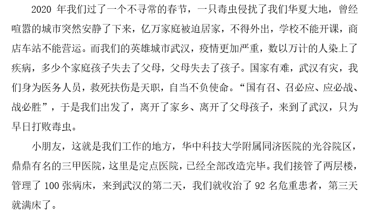在信中,叔叔阿姨们首先向小队员们表示了感谢之情;并介绍了医疗队所在的医院收治病人的情况,用图片呈现了医务人员奋战一线的日常;最后,对小队员及我校全体同学寄予无限的期望。