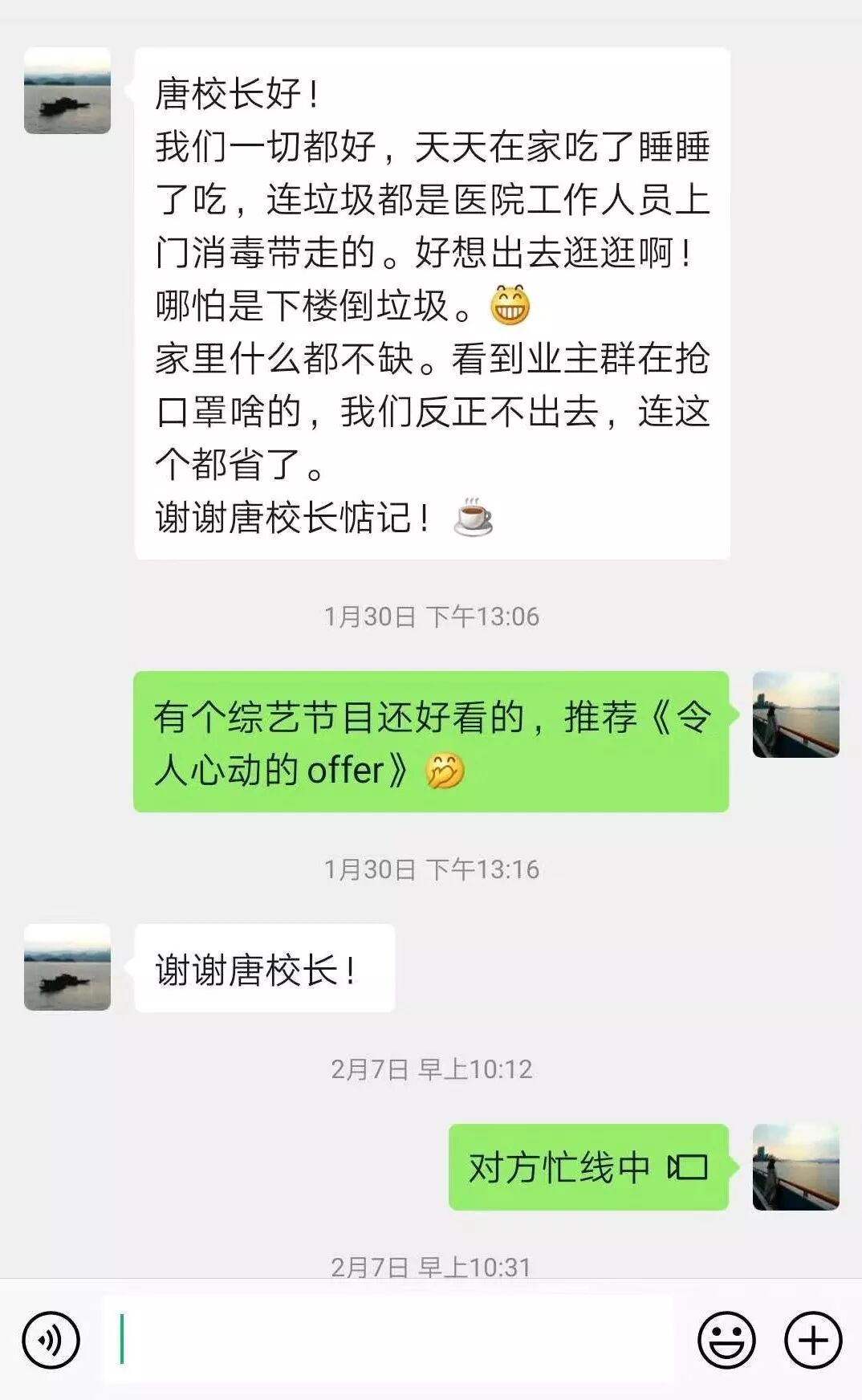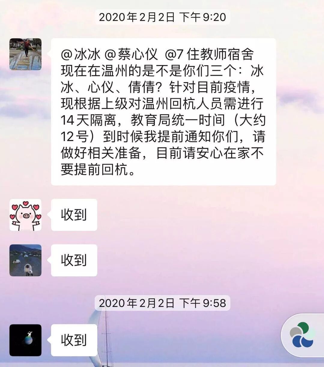 在我校老师返杭居家隔离期间,唐校长给予慰问与关怀。对于身在温州的老师,校级领导和工会老师也时时关心。