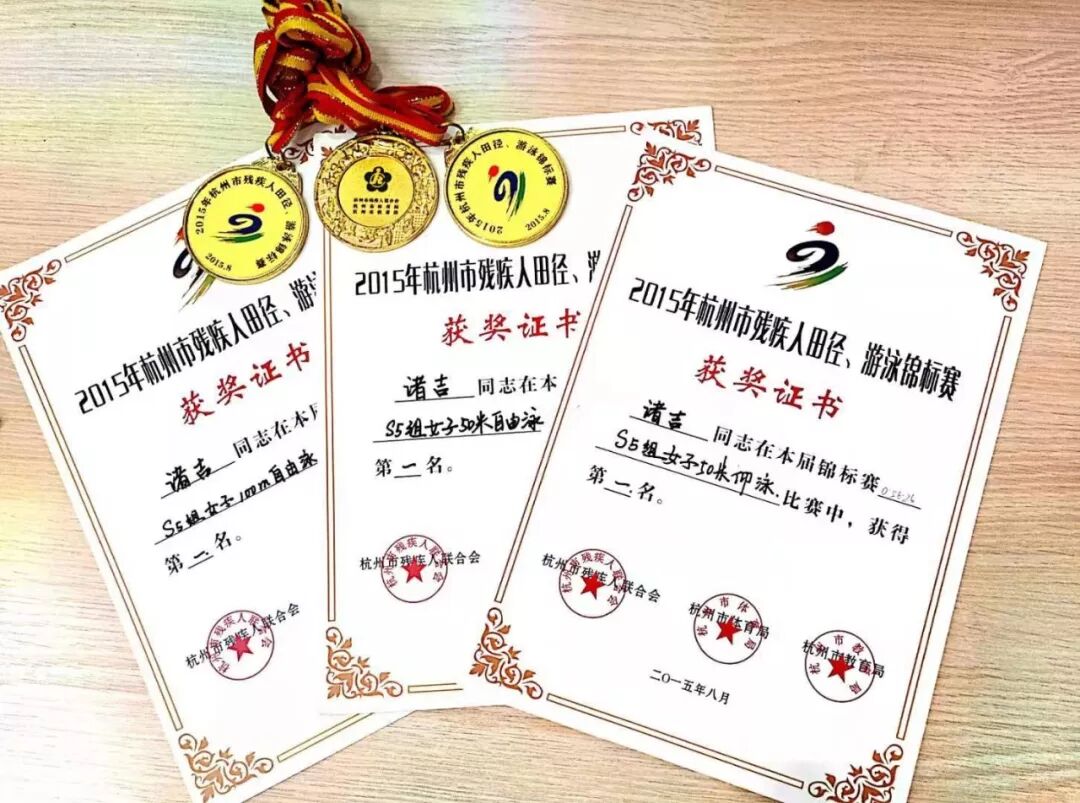 20158诸吉获得杭州市残疾人田径、游泳锦标赛女子S5100m自由泳第一名,S550m自由泳第一名,S550m仰泳第一名。