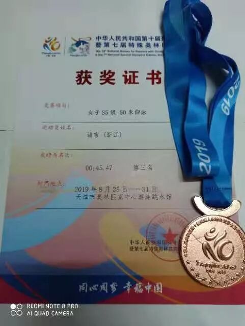 20187诸吉获得杭州市第十届残疾人运动会S10 50m自由泳第三名,SB9 100m蛙泳第三名,S10100m自由泳第三名。