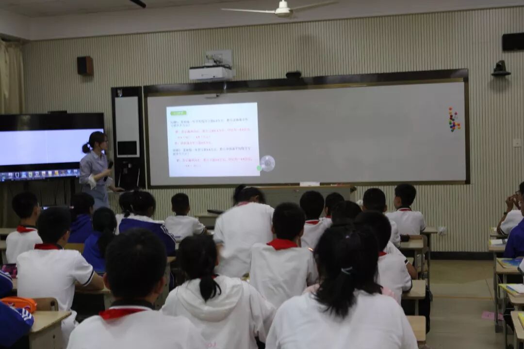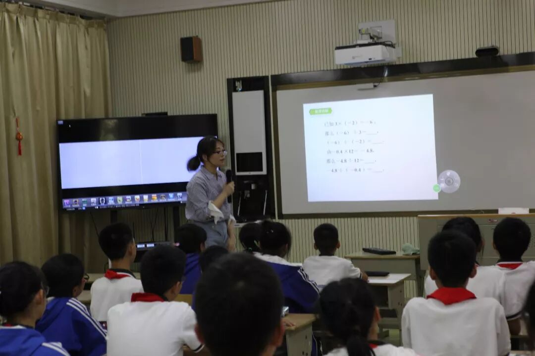 党员老师吴倩雯带领七年级的学生学习了有理数的除法,她通过合作探究,归纳总结出有理数除法法则,从而使学生进一步掌握有理数乘除法之间的关系,能把有理数除法运算转化成乘法运算。两地的学生专注学习,讨论积极。吴倩雯老师通过练习,让三校学生熟练掌握有理数除法法则进行计算,进一步提高了学生的运算能力。