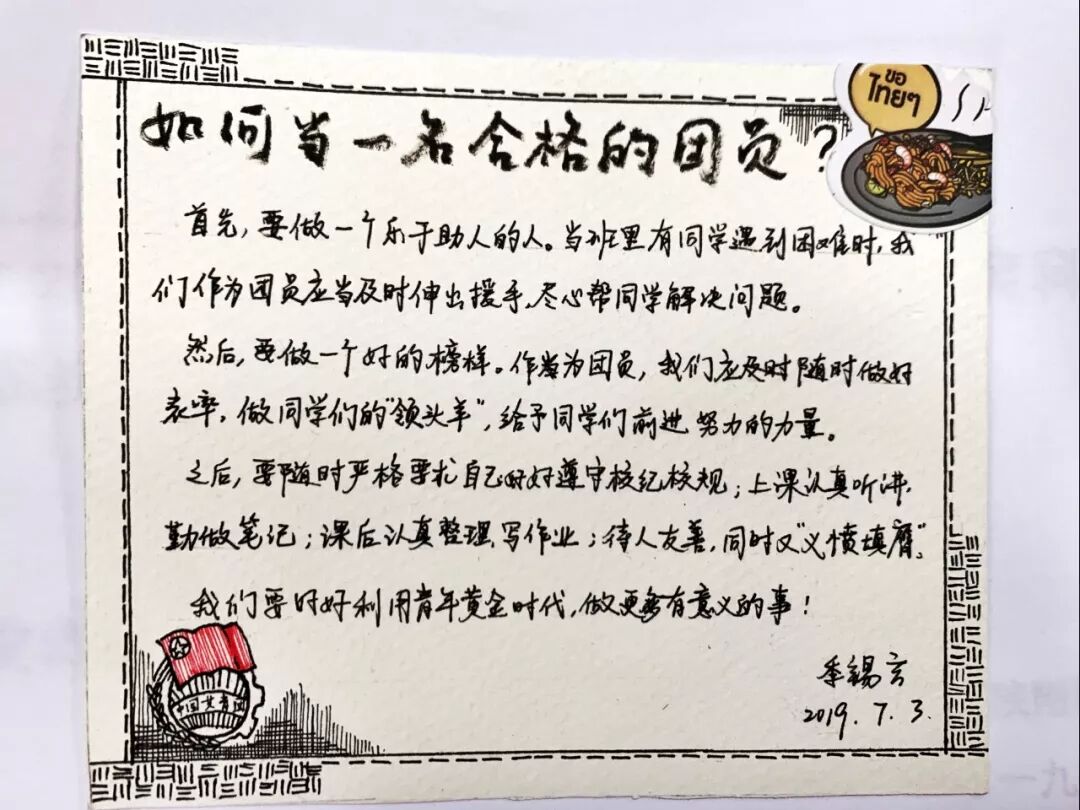 我校团委书记邵雯老师开展了《基础团务知识》的团课学习。邵老师耐心地向大家普及了共青团团员与入党积极分子的相关知识,帮助同学们明确了今后努力的方向。最后,同学们还完成了一份别样的课后作业:如何做一名附校的优秀团员