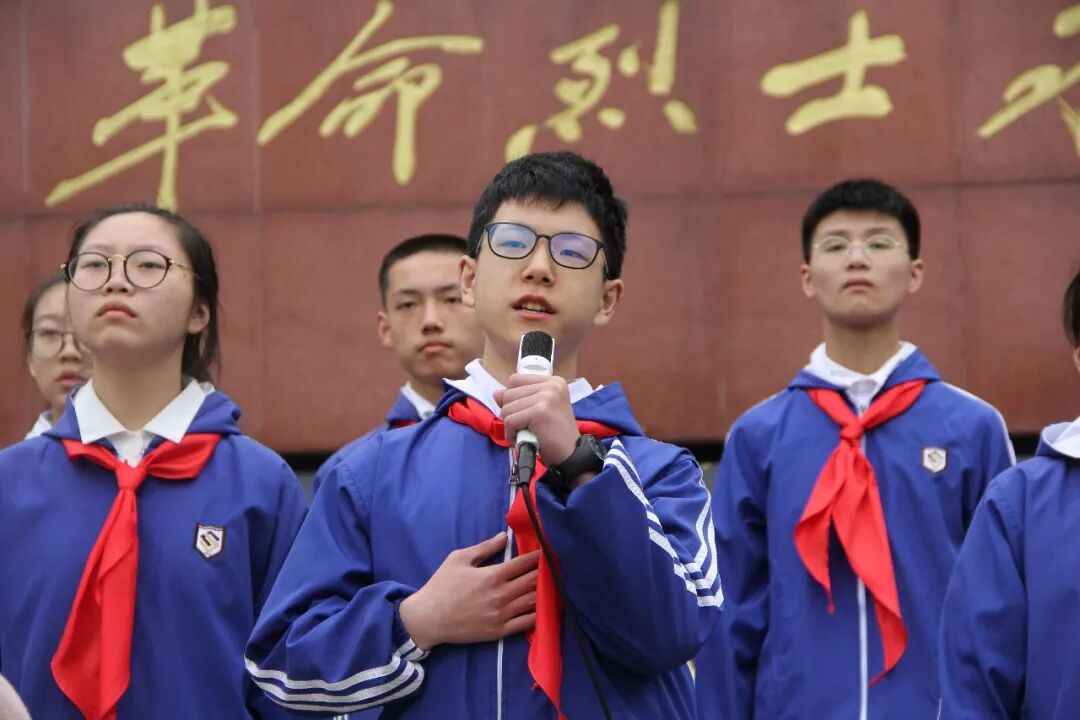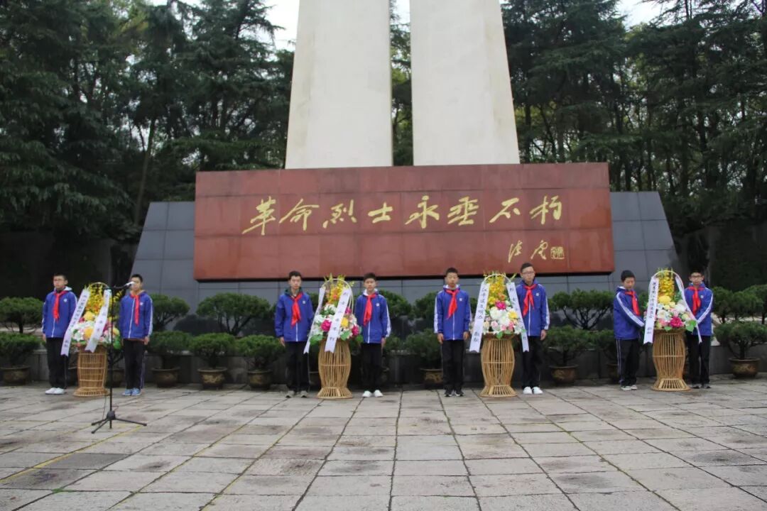 仪式正式开始。全体立正,奏唱国歌,少先队员们肃立在高大的烈士碑前,缅怀革命先辈。