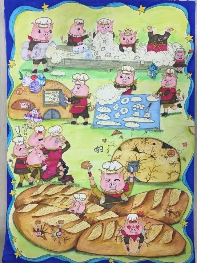 今年已经是我第三次参加国际少儿动漫大赛了看到此次大赛的三个绘画主题,我开心地蹦了起来,因为我竟然看到了有一项是美食畅想,我可是个名副其实的小吃货呀,各式各样的面包是我的最爱。“我一定要好好画!”我默默地对自己说。美术课上陈老师告诉我们,想要画好美食创想,可以把美食的制作过程画下来。我突然有了一个想法,今年是猪年,我就画小猪做面包吧!于是,我的《小猪的面包宴》作品就出炉了                                  ——502吴涵宁