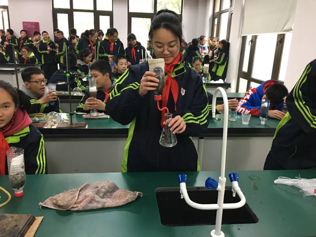 比赛中老师将浑浊的泥浆水倒入学生们自制的过滤器装置中,观察滤液的澄清程度,反映出自制过滤器的过滤效果。不少学生在比赛过程中发出感慨:“如果有一天在荒岛,我们就可以通过类似的方法,得到较干净的水啦!”