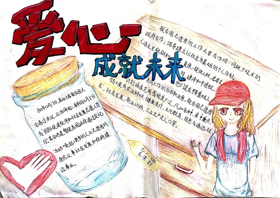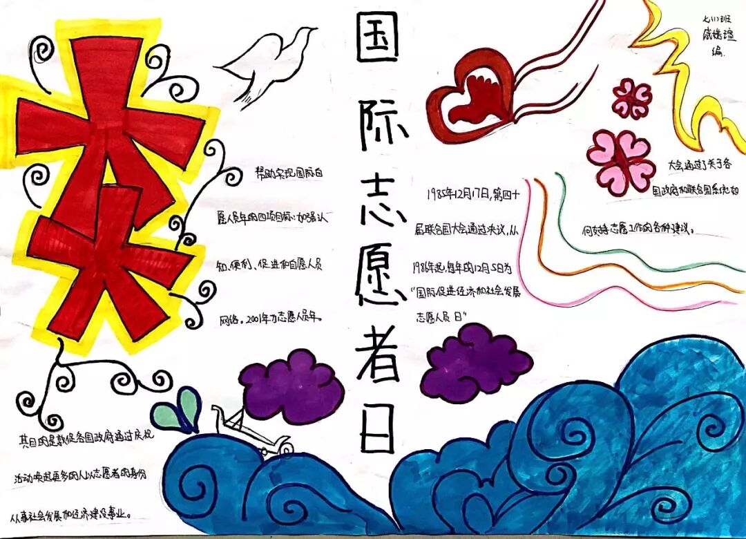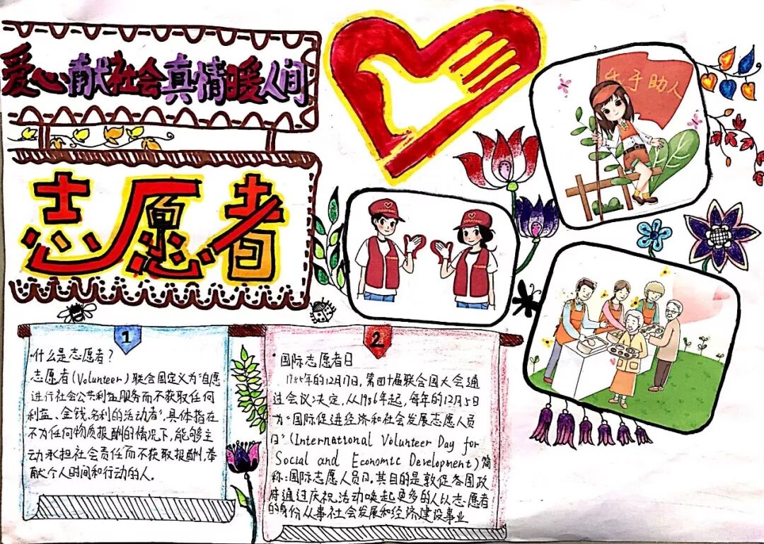同学们搜集资料,拿起画笔,画出一张张小报,宣传志愿者的精神。