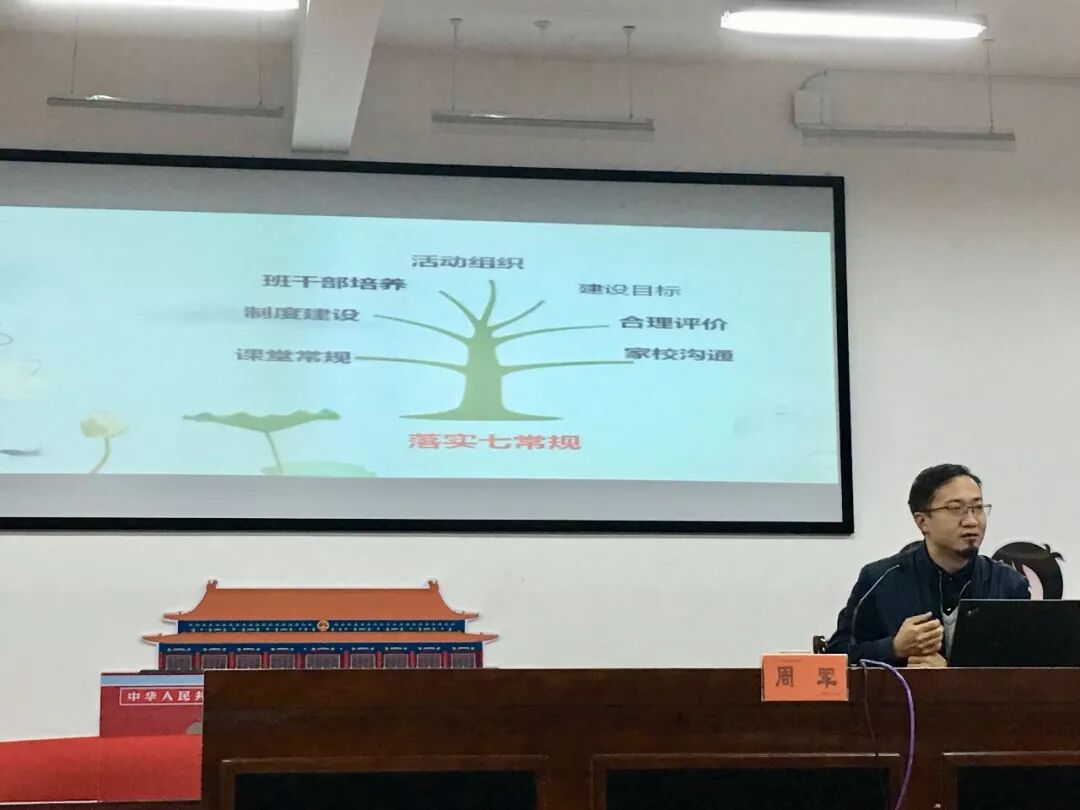 我校的名班主任——周军老师与三个学校的班主任们分享了自己在班主任工作中的成功经验——《慢德育理念下的班级文化建设》。周老师风趣幽默,结合自己在带班过程中遇到的实际事例来分享自己的心得体会,提倡做一位“有趣、有容、有识、有情”的“四有”班主任。