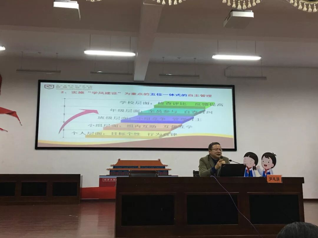 我校罗志强书记向两所结对学校——江山市城东实验学校和江山市四都初级中学介绍了我校的基本情况,分享了自建校以来,我校在德育管理上的行动和成效。