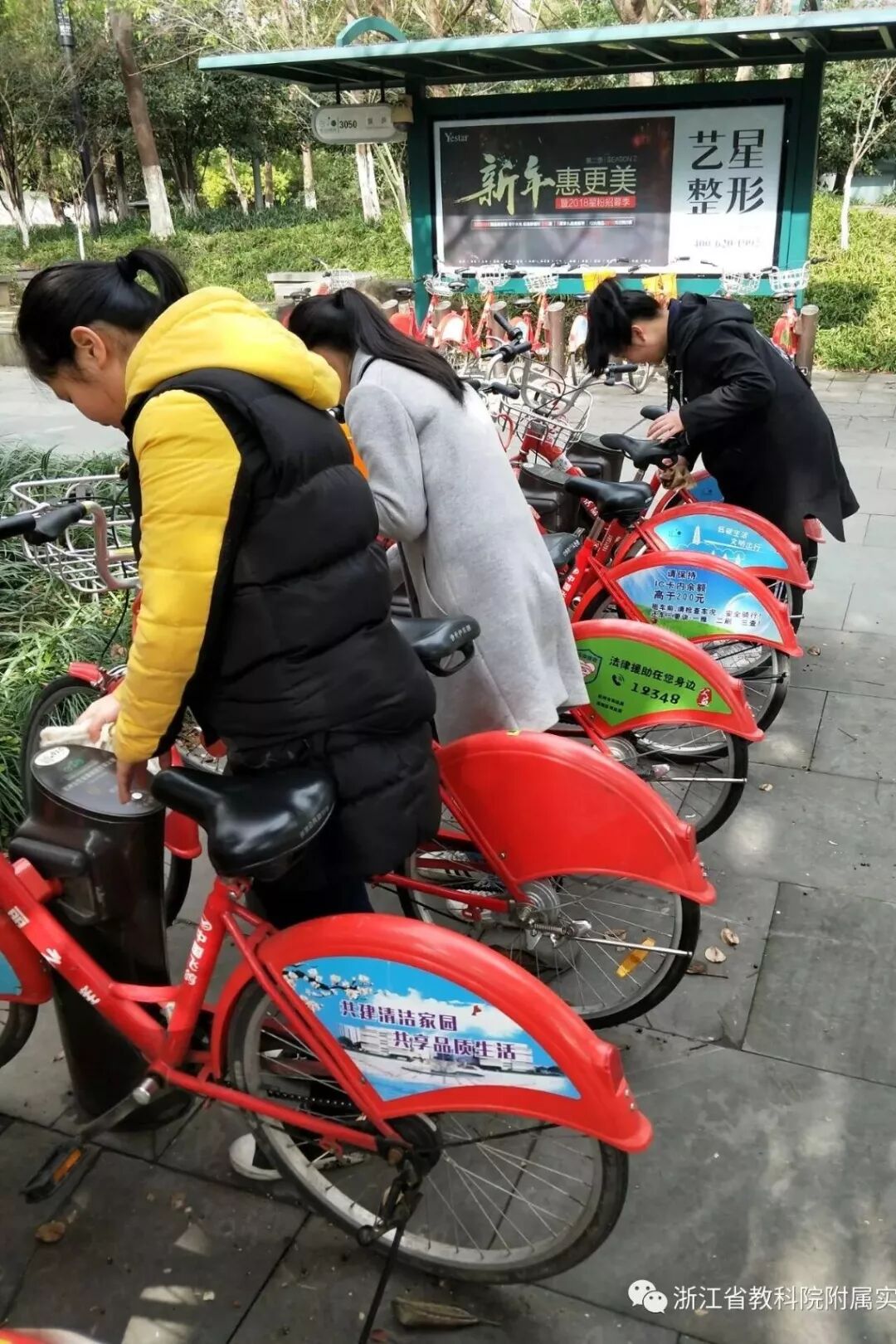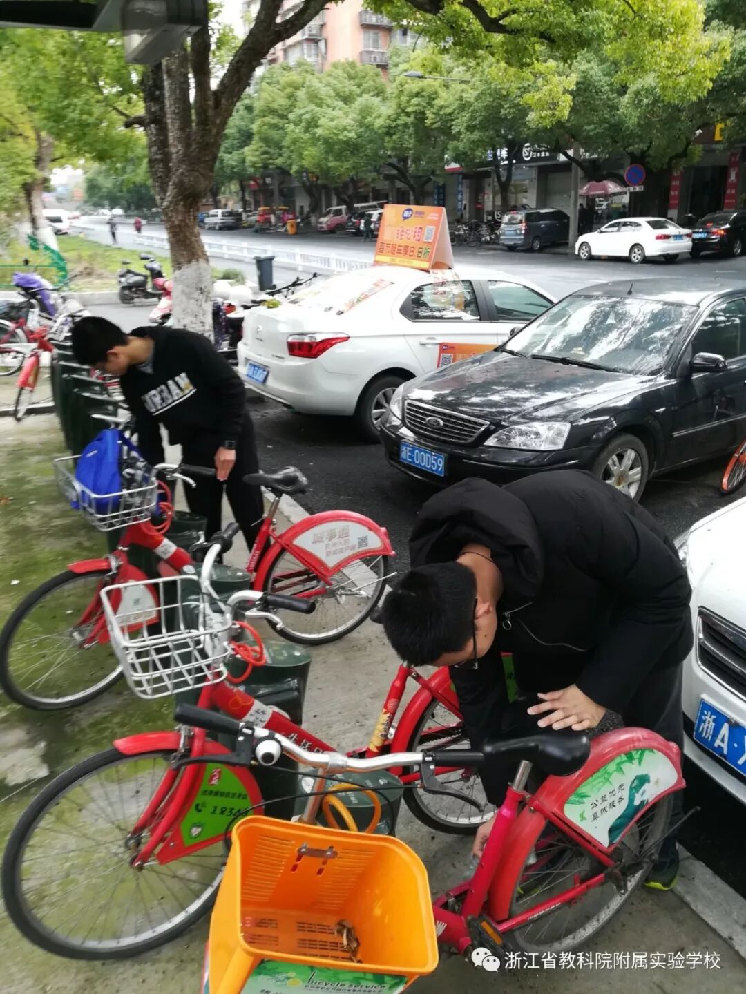 公共自行车点出现了九二班同学的身影,在他们的通力合作下,“小红车”焕然一新。“迷路”的共享单车,也被大家送回“家”。