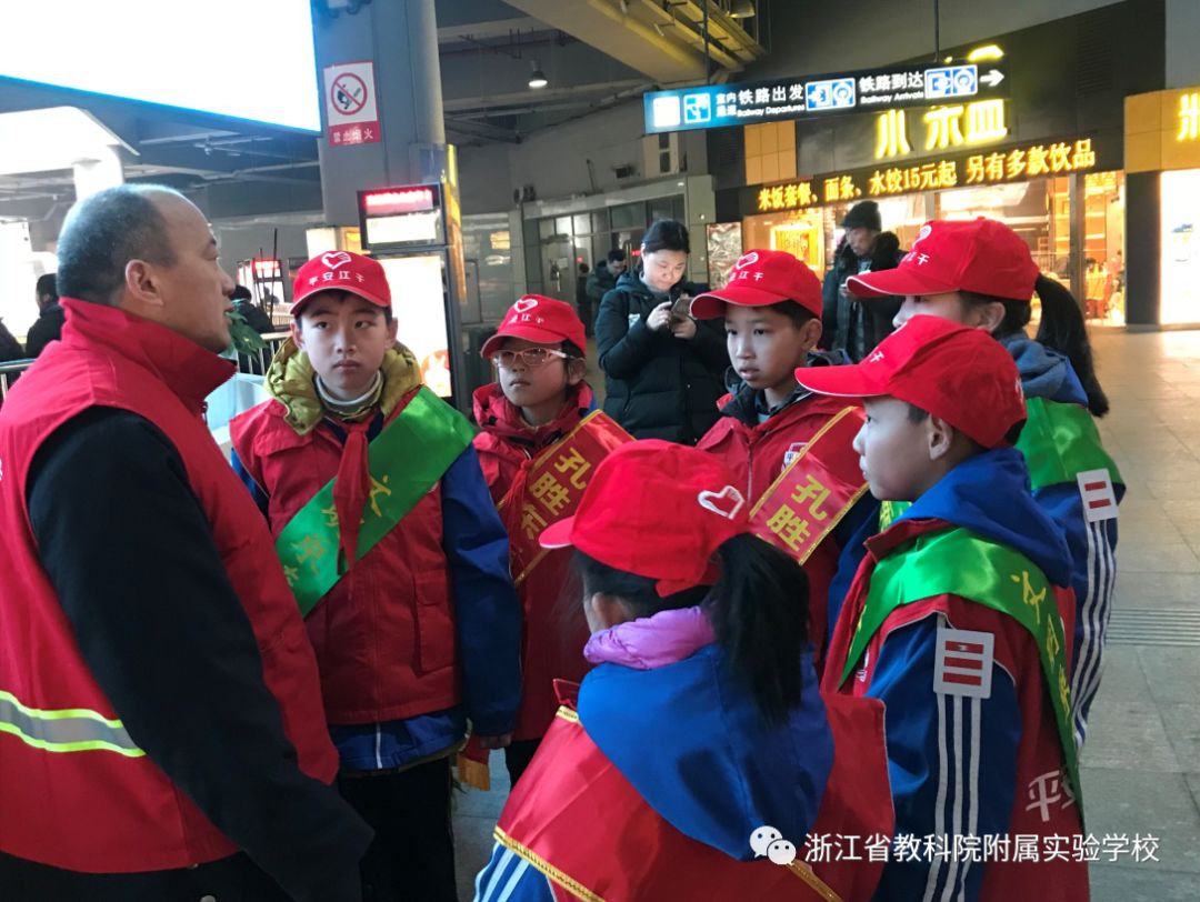 为了听从习爷爷的教诲,学习和贯彻十九大精神,浙江省教育科学研究院附属实验学校403中队“阳光小队”在寒假中开展了“沿着习爷爷的足迹,寻访美丽杭州”的主题社会实践活动。队员们来到杭州火车东站,寻访全国劳动模范、全国道德模范孔胜东伯伯,学习志愿精神,学习奉献精神,并和孔伯伯一起进行了“交通文明”的劝导活动。