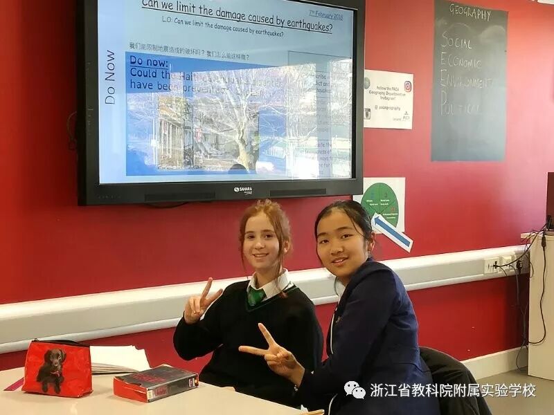 英国的课堂讲求生与生之间的相互合作。八(4)班的程颖欣小朋友在地理课上和她的英国小伙伴一起合作用文字和图画来展现岛屿的形成、火山喷发的过程。程颖欣说:“这节地理课让我体会到了合作的力量、小伙伴之间的互相帮助和思维的碰撞。”同学们还说:本来还怕自己英语表达不是太流利,会被英国小伙伴嘲笑,但是小伙伴们都会耐心听大家慢慢讲完——被尊重的感觉真棒,英国绅士风度果然名不虚传。