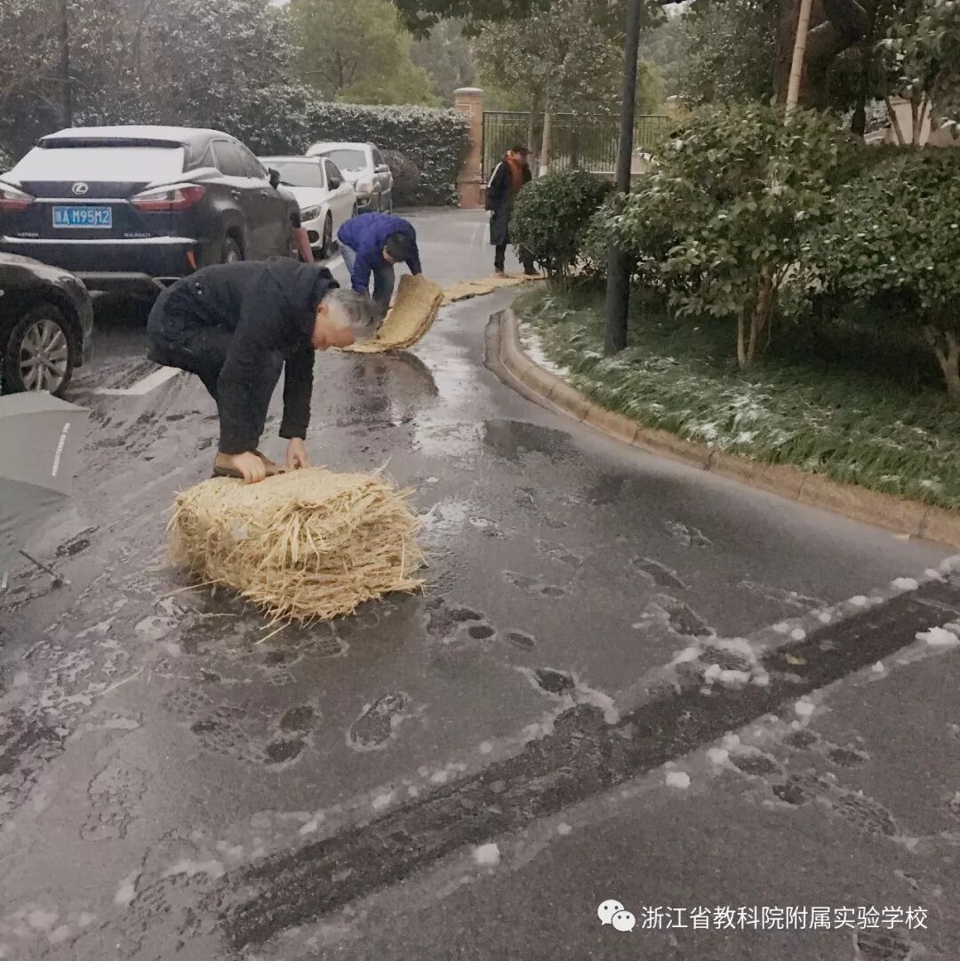 短短的半小时里,从校门口开始一直向内延伸,各条老师和学生必经的道路已被清理完毕。在食堂外的阶梯处,还有自行车库的斜坡上,也都铺上了草垫。