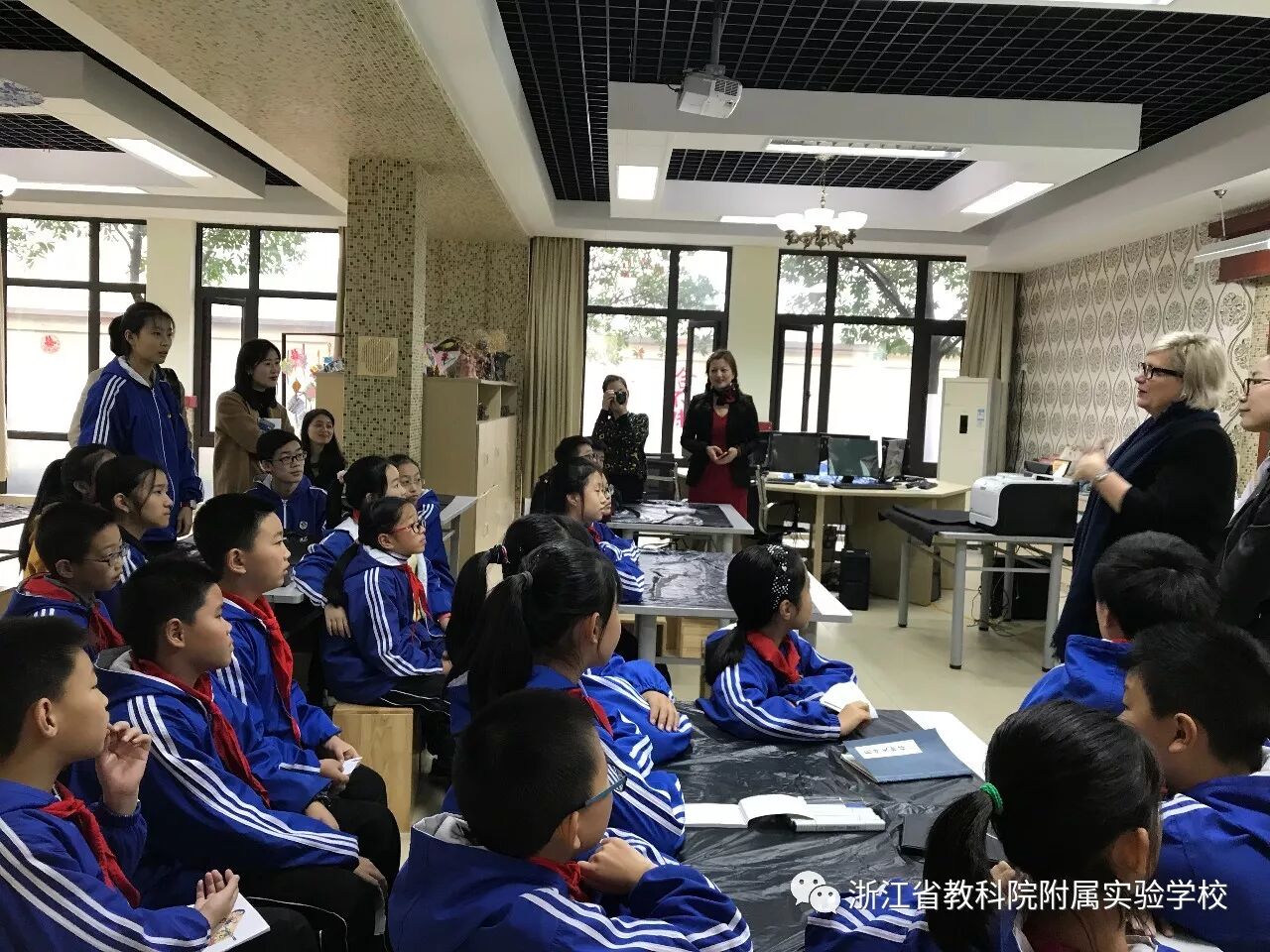 美术陈捷老师向英国来宾介绍了我们学校的特色社团——七彩坊动漫社,孩子们的优秀作品和辛勤努力获得了Scott校长和Linda的好评。
