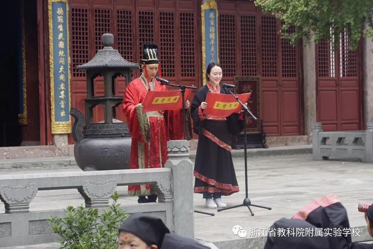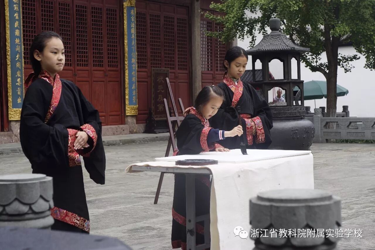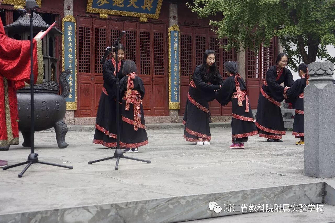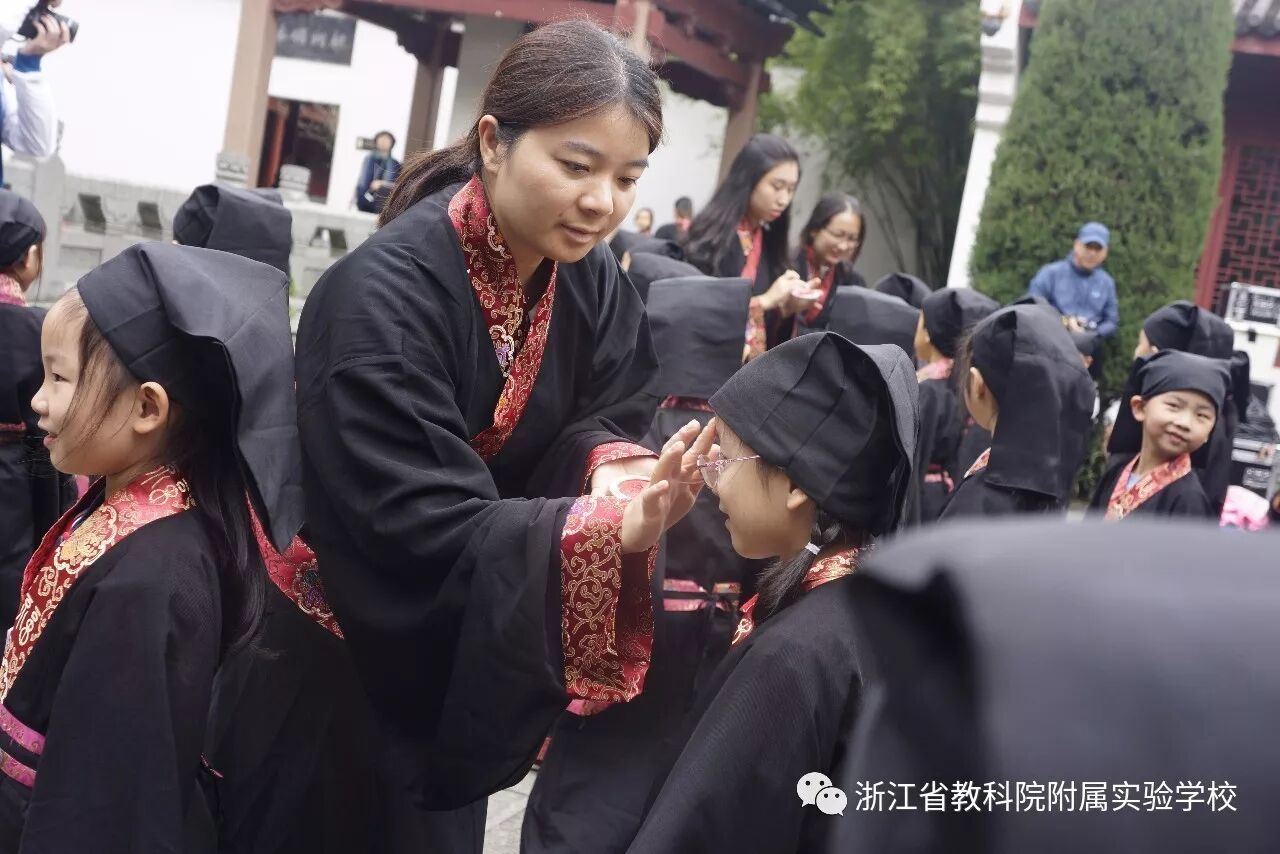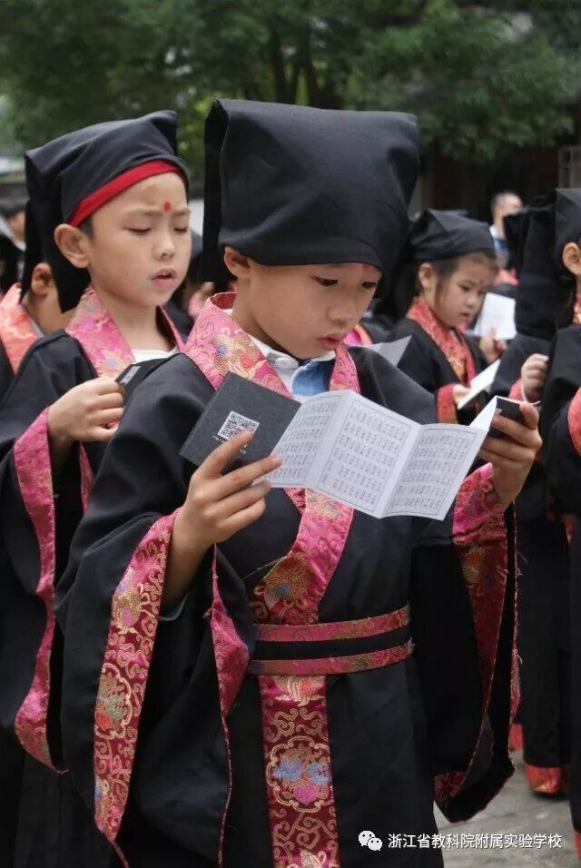 仪式开始,孩子们马上沉静下来,在古朴的音乐声中开始自正衣冠。所谓先正衣冠,后明事理,也是让孩子们知书明理的第一步。