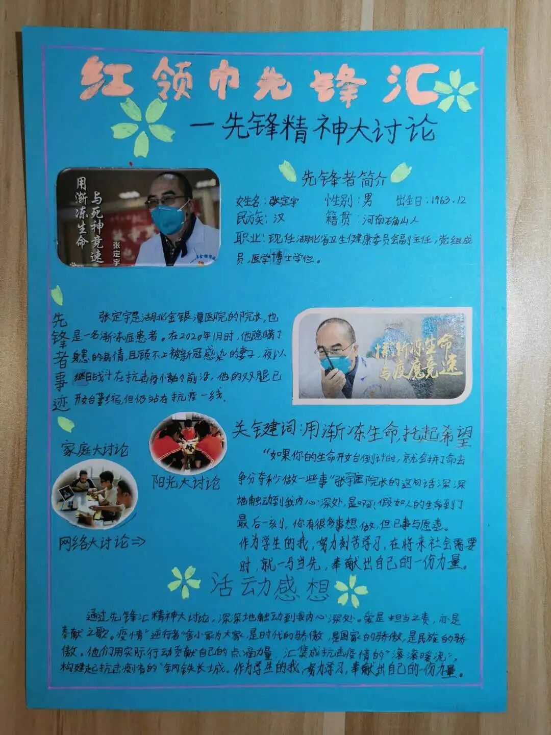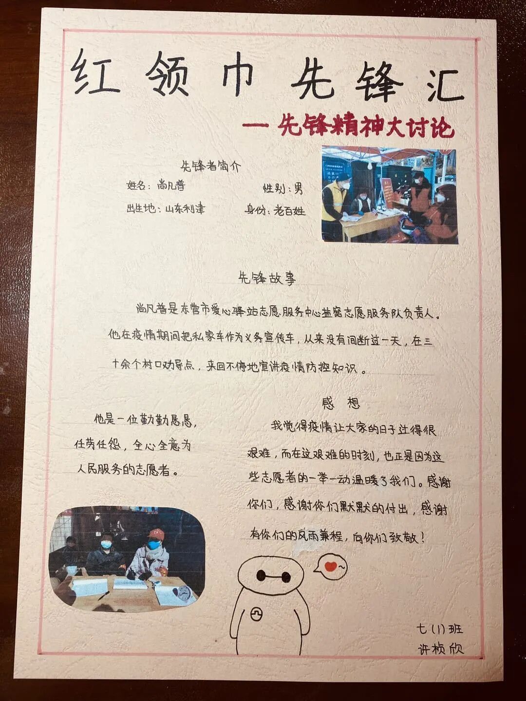 七(1)中队阳光小队队员们利用在线视频会议,讨论详细的活动方案,周密安排每一个活动过程,通过采访家人、邻居、在线搜索先锋资料、去书店实地查阅书籍等方式了解先锋事迹,每个队员把自己搜集的资料制作成“先锋精神大讨论”记录,再次在视频会议中进行分享交流。本次活动主要以线上讨论交流为主,结合小型线下活动,在确保安全、卫生的情况下圆满完成,队员们受益匪浅。