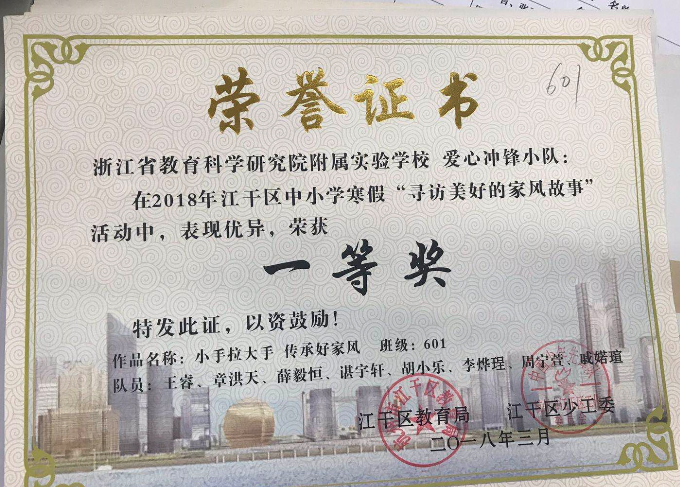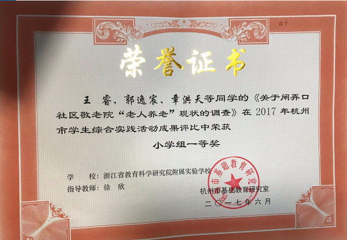 果然,她班的孩子们真的是一群向阳花,热心环境保护,热心志愿者服务,积极推动垃圾分类、“五水共治”等宣传活动,向社区敬老院的爷爷奶奶开展志愿者公益活动……他们愿像向日葵一样,向着太阳茁壮成长。孩子们的社会实践活动屡屡获奖,王睿、郭逸宸和章洪天的综合实践活动成果还获得杭州市一等奖。