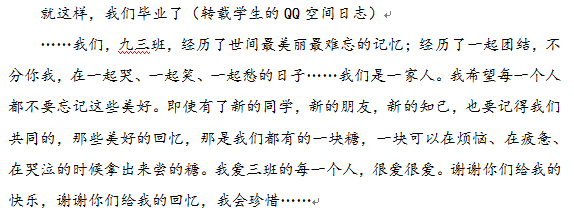 胡老师通过各种形式的班会和主题教育活动,充分发掘学生的潜能,尽力调动学生为班级献计献策的积极性与创造性。每次活动的开展,离不开班委的金点子,更离不开每位同学从旁协助。班内的学生各方面的能力经过三年的磨砺,都有了一定的提高。