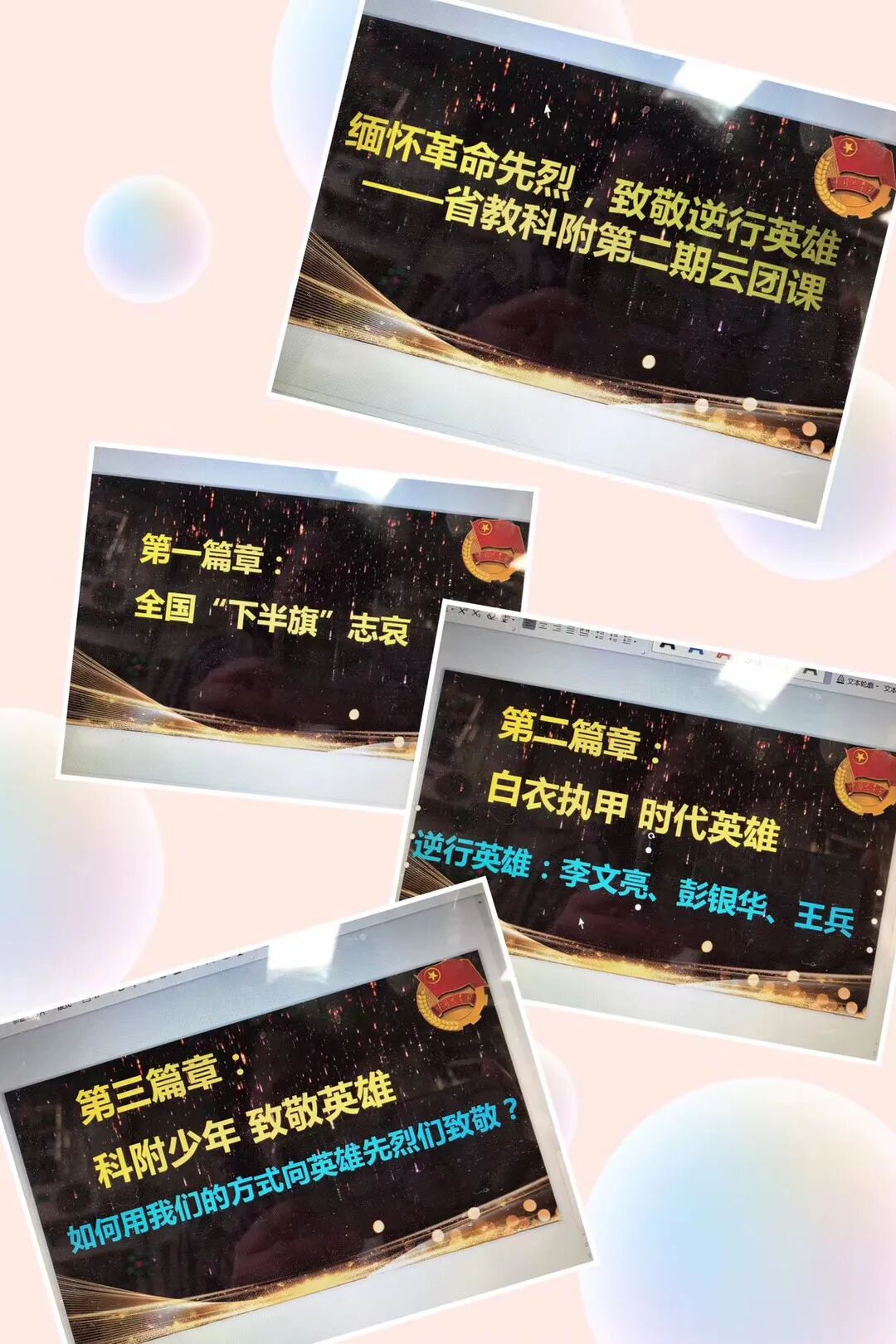 疫情当前,一场别开生面的队课、团课在省教科附少先队员、共青团员QQ群中逐步展开。为了上好此次“云队课、云团课”,班主任们专门收集抗击疫情中的感人故事,先进典型、制作课程短视频。在内容安排上,除了课程,还安排了网络互动、撰写课后感想云祭奠等,同学们都触动很深。