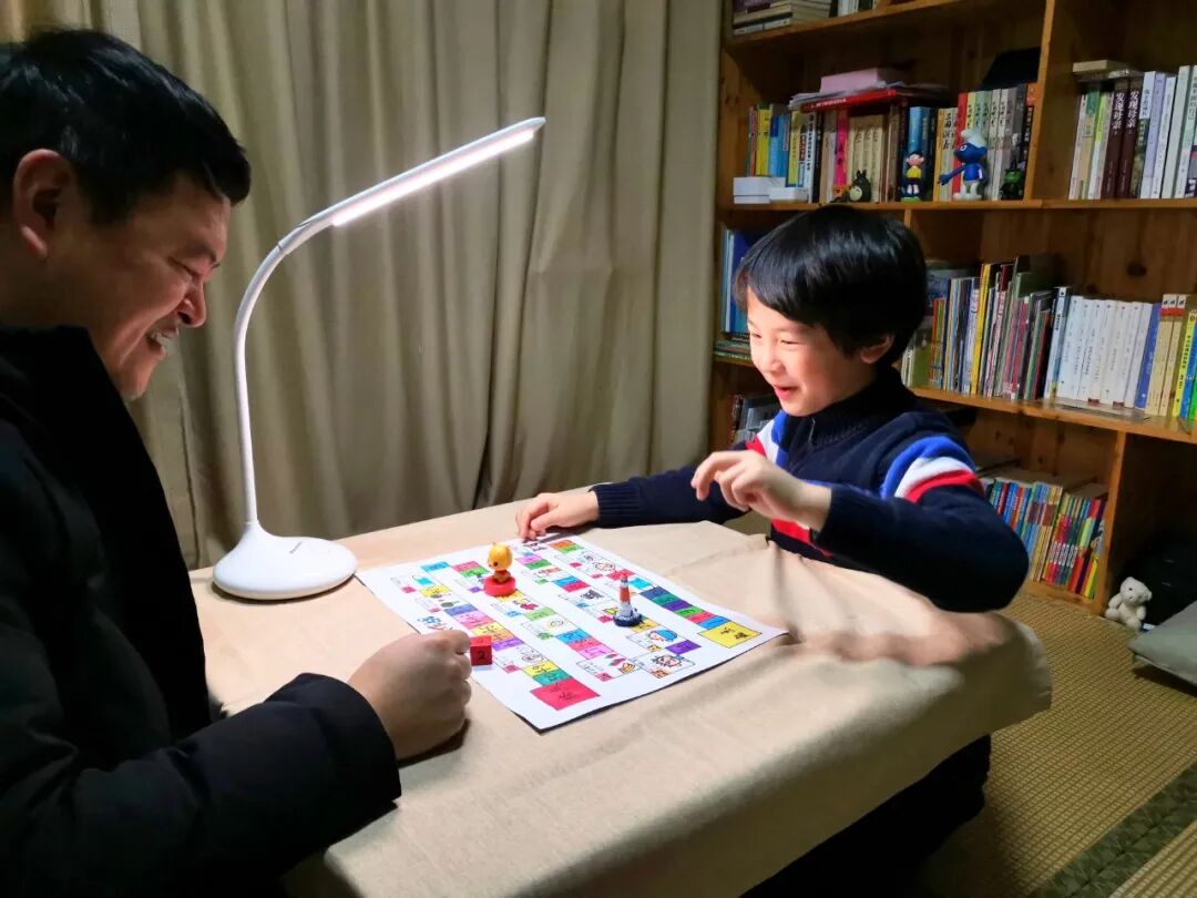 出门戴上有效口罩前进8格;正确使用酒精消毒前进2格;健康饮食、坚持锻炼也前进2格…… 但是,要是没带口罩,就要立刻退回起点!滕同学和爸爸玩得不亦乐乎。