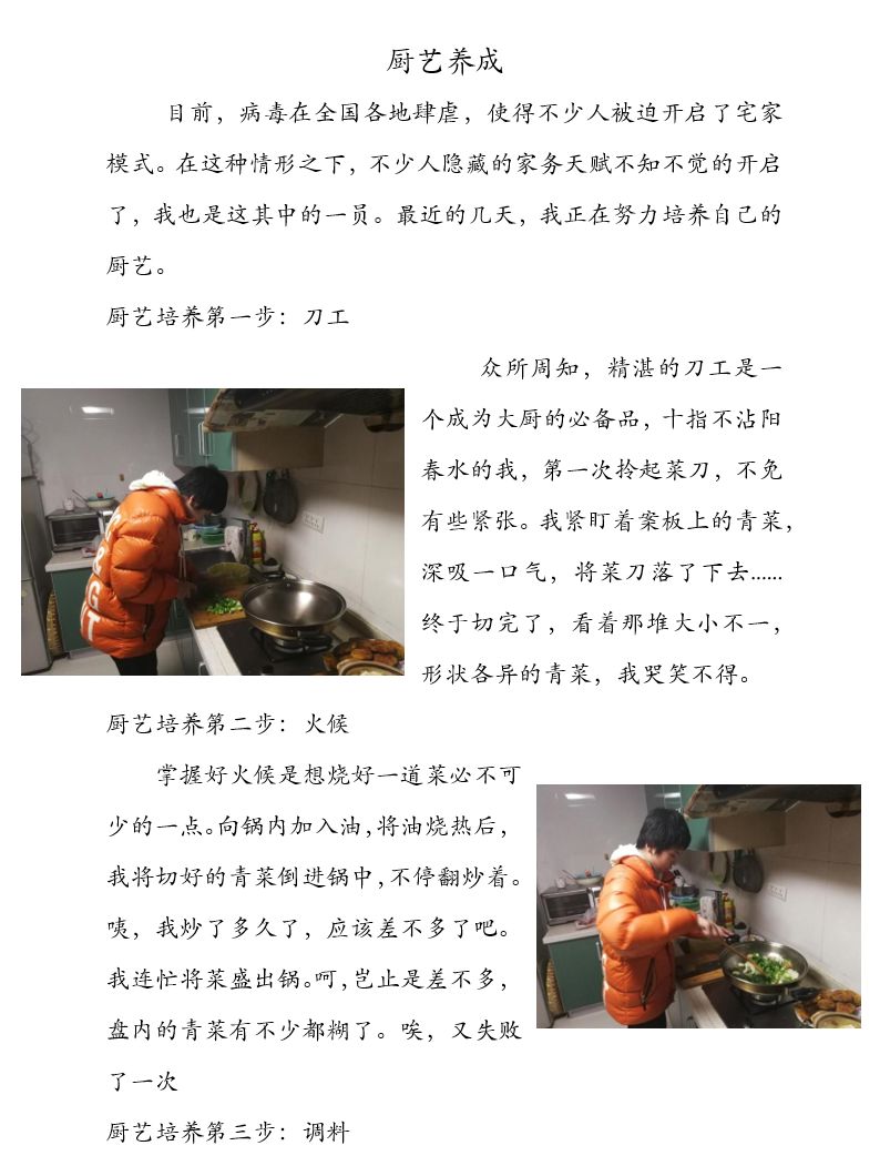 居家时光也激发了不少同学的“厨神”潜质,他们用照片和文字记录了美妙的厨房时光。 “无穷的远方,无数的人们,都与我有关。”同学们身在家中,心也牵挂着远方的人们,他们录制视频,或以“笔”为“声”,为远方的人们祈祷祝福,为我们的祖国加油呐喊!