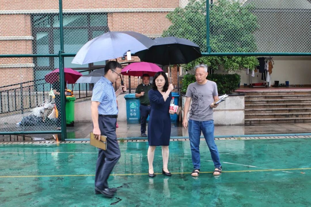 唐校长首先从学校暑期工作、开学准备、重点记录、目前困难四个方面进行了汇报。 刘组长对学校的工作进行了肯定和指导。 费局从四个方面对学校提出工作期望,强调我校需要深化特色,将现有的科研成果运用于教学之中,利用好九年一贯学校的先天优势,在一体化管理中实现针对性和规范化,做高标准、高要求的精致化教育。 随后,针对校内存在安全隐患这一问题,区领导和校领导一同前往我校学校操场及篮球场进行实地排查。